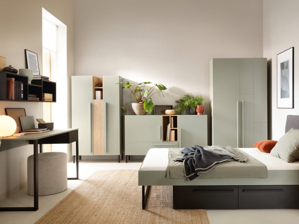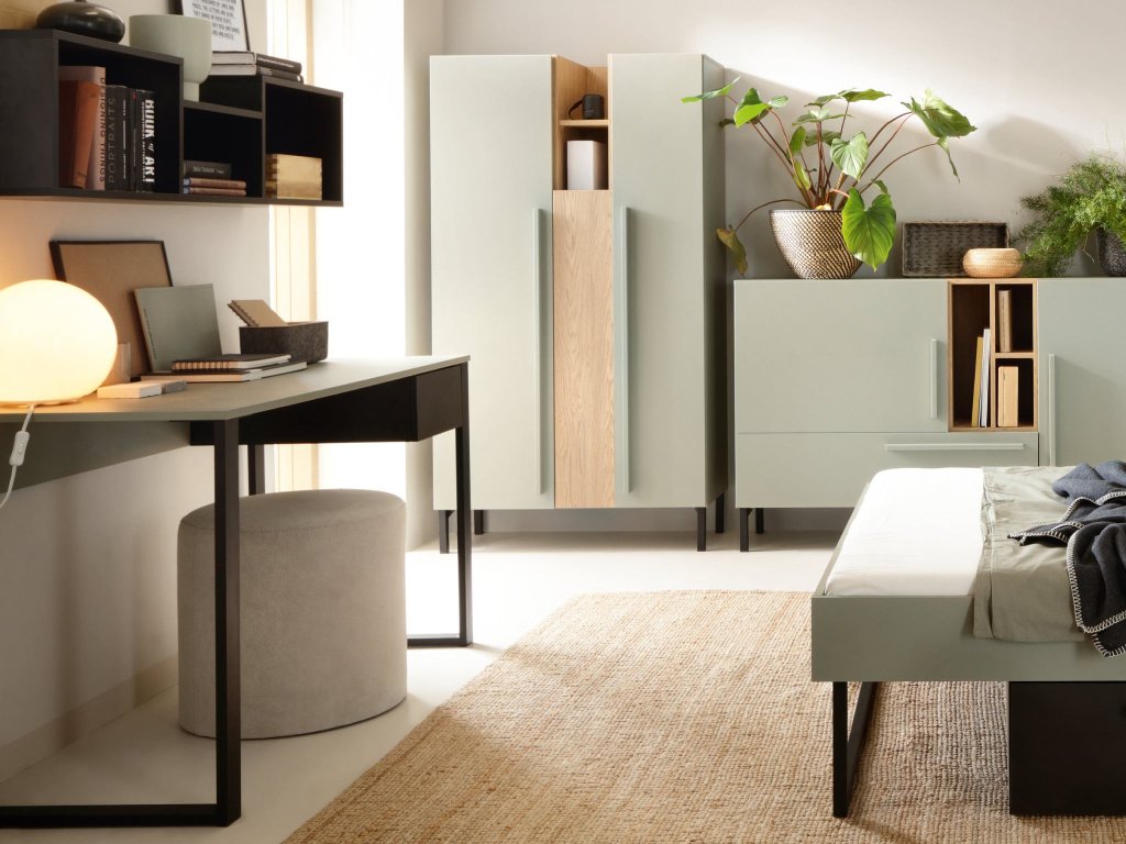 Praktikus és stílusos SERGIO gyerekszoba bútor garnitúra, amely kamaszok szobájába, de kisebb gyerekek gyerekszobájába is megfelelő lehet. Ez az időtálló kollekció lányoknak és fiúknak is egyaránt megfelelő. Két gyönyörű színváltozatban érhető el: bézs és zöld színekben. Minden komód, ruhásszekrény és polcos szekrény magas fekete lábakkal és hosszú keskeny fogantyúkkal rendelkezik. Az egyes bútorok minőségi 16 mm vastag laminált bútorlapból készülnek ABS furnérral biztosítva. A zöld színben készült bútorok balti tölggyel és antracit színekkel vannak kombinálva, míg a homokszínű elemek olajozott tölggyel és sötétkékkel az egyes fiókokon.