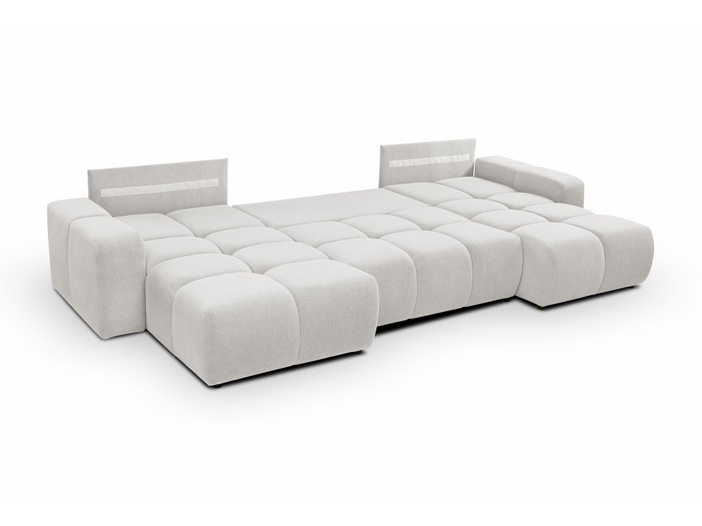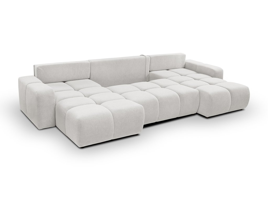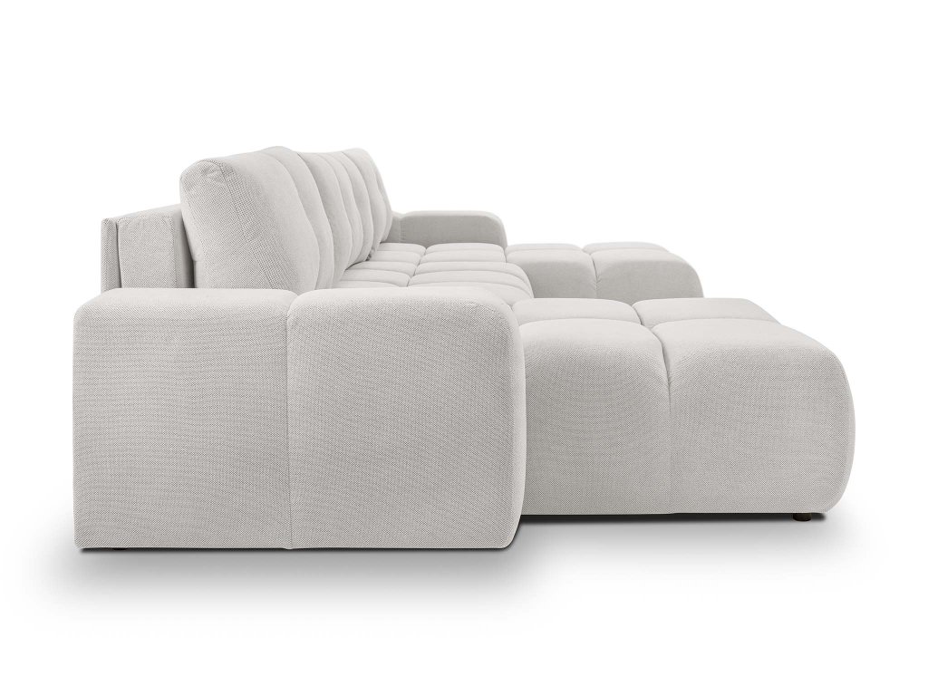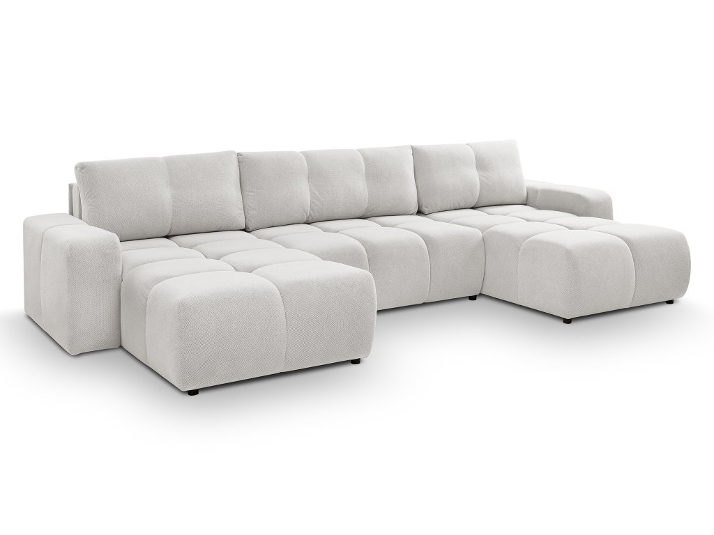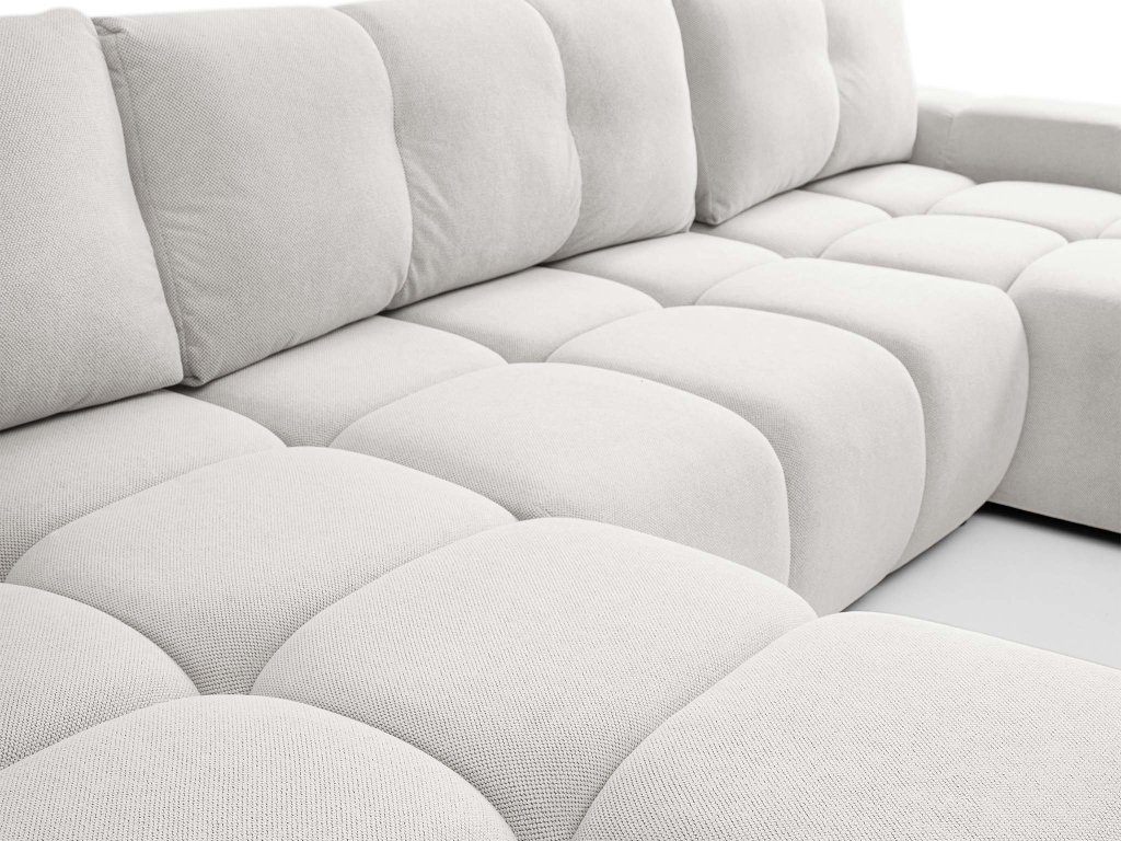 A SOHO U alakú szürke színű nagy méretű ülőgarnitúra egy modern és stílusos bútordarab, így gyönyörűen beillik bármilyen stílusú nappaliba. Tökéletes választás nagycsaládosoknak, illetve azoknak, akik gyakran fogadnak vendégeket, hiszen bőséges ülőhelyet kínál mindenkinek. Ezt az ülőgarnitúrát imádni fogja a praktikus funkcióinak köszönhetően. Szükség esetén ugyanis vendégággyá alakítható, így egyszerűen egy kényelmes 303x140 cm méretű fekhelyet varázsolhat vendégeinek. A beépített ágyneműtartó helyet biztosít a plédeknek, ágyneműnek és párnáknak. A kényelmes ülőhelyről a minőségi PUR hab (T-3042 és T-2542 típus) gondoskodik. A stabilitást a rétegelt falemezből, forgácslapból, HDF lemezből és tömör fenyőfából készült masszív szerkezet biztosítja. A háttámla T-1620-as PUR habbal van kitöltve, így tökéletes támaszt nyújt a hátnak, míg a T-3042-es habbal ellátott kartámla még kényelmesebbé teszik az ülést. A kihúzható kanapé fekete műanyag lábakon áll.