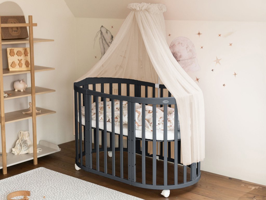 Sötétszürke 7az1-ben növekvő kiságy szett Champagne tüll baldachinnal