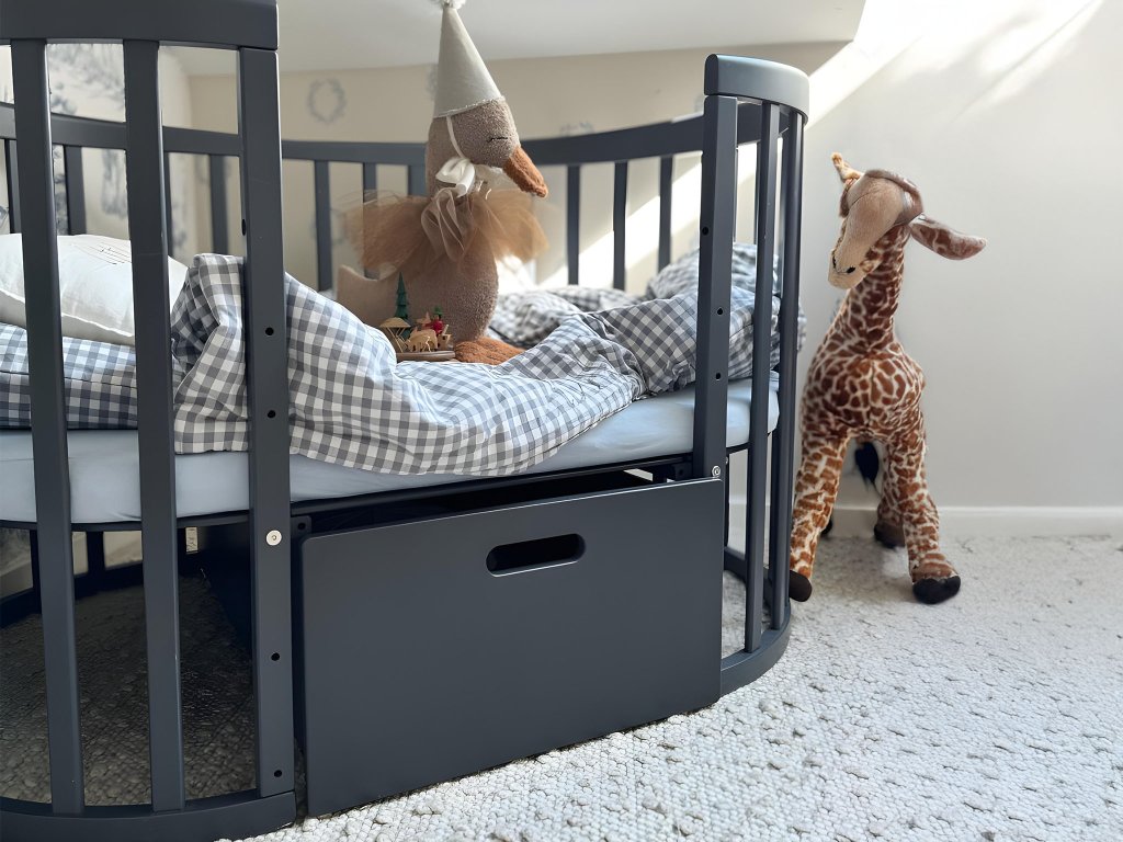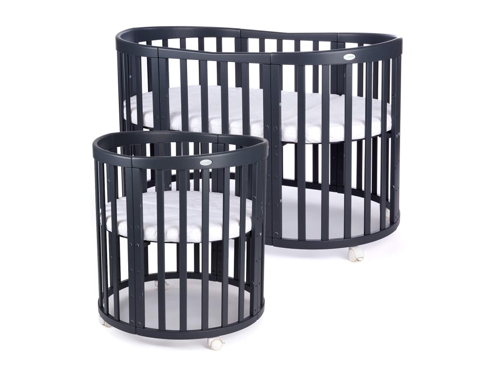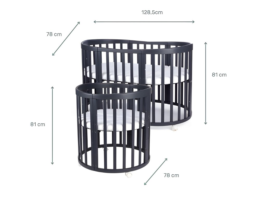Sötétszürke színű 7az1-ben kiságy - az ovális ágy különböző összeállítási lehetőségei biztosítják, hogy újszülött kortól egészen tízéves korig használható legyen. Az ágy összeszerelésének módja a gyermek korától és igényeitől függ. Az ágy olyan biztonsági funkciókkal is rendelkezik, mint például a görgőkön lévő biztonsági fékek. A háromrészes matrac T25-ös habból készült pamut huzattal. A huzat 30° C-on mosható. Az ágyrács 5 magassági pozícióba állítható. A legalacsonyabb 7 cm, ebben a pozícióban járókaként használható. A legmagasabb pozíció pedig 49 cm. Amennyiben a gumis görgőket felszereli az ágyra az ágyrács magassága a legmagasabb pozícióban 55 cm lesz.