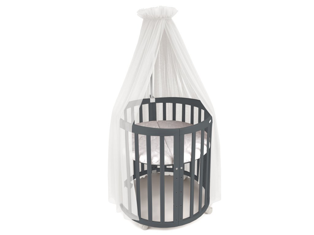 Sötétszürke színű 7az1-ben kiságy - az ovális ágy különböző összeállítási lehetőségei biztosítják, hogy újszülött kortól egészen tízéves korig használható legyen. Az ágy összeszerelésének módja a gyermek korától és igényeitől függ. Az ágy olyan biztonsági funkciókkal is rendelkezik, mint például a görgőkön lévő biztonsági fékek. A háromrészes matrac T25-ös habból készült pamut huzattal. A huzat 30° C-on mosható. Az ágyrács 5 magassági pozícióba állítható. A legalacsonyabb 7 cm, ebben a pozícióban járókaként használható. A legmagasabb pozíció pedig 49 cm. Amennyiben a gumis görgőket felszereli az ágyra az ágyrács magassága a legmagasabb pozícióban 55 cm lesz.