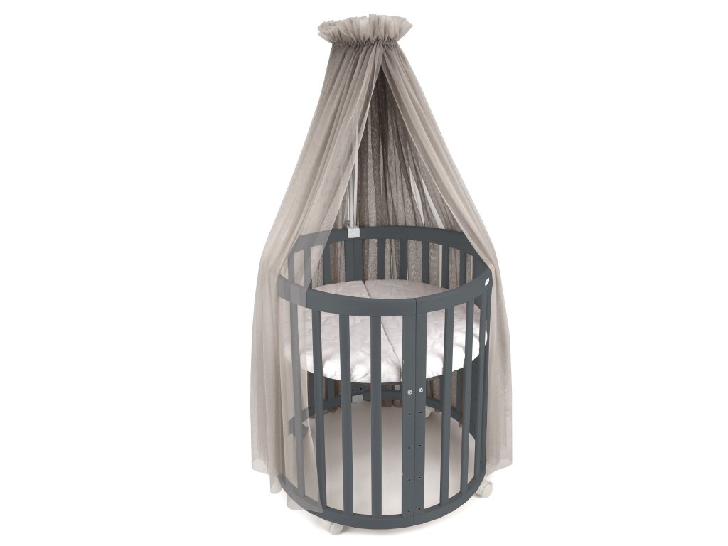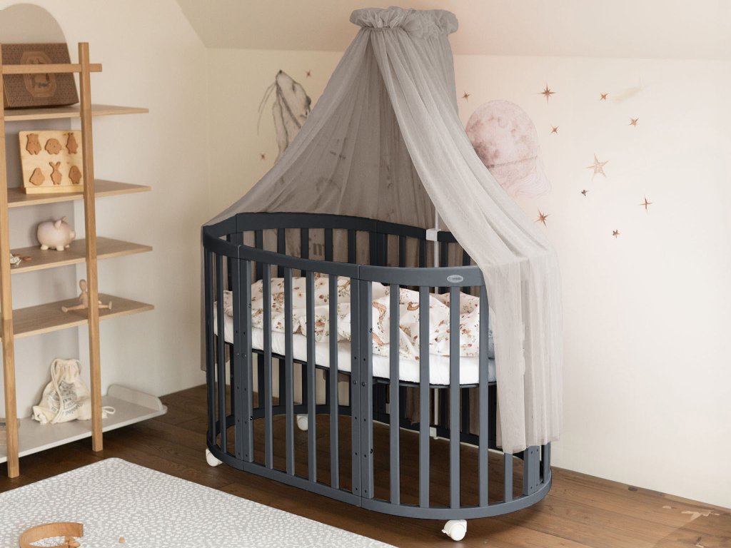 Grafitszürke színben készült 7az1-ben növekvő kiságy gyönyörű Taupe színű tüll baldachinnal elérhető áron.