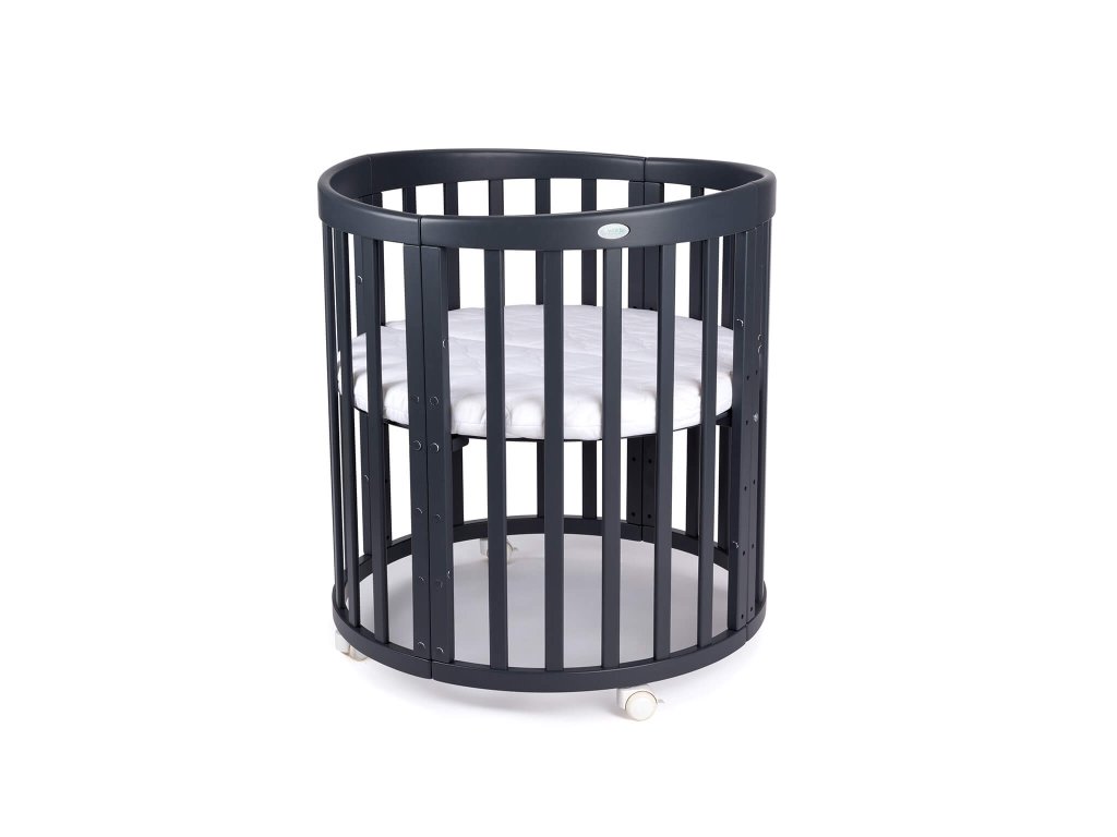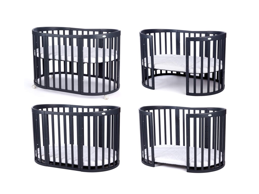 Sötétszürke színű 7az1-ben kiságy - az ovális ágy különböző összeállítási lehetőségei biztosítják, hogy újszülött kortól egészen tízéves korig használható legyen. Az ágy összeszerelésének módja a gyermek korától és igényeitől függ. Az ágy olyan biztonsági funkciókkal is rendelkezik, mint például a görgőkön lévő biztonsági fékek. A háromrészes matrac T25-ös habból készült pamut huzattal. A huzat 30° C-on mosható. Az ágyrács 5 magassági pozícióba állítható. A legalacsonyabb 7 cm, ebben a pozícióban járókaként használható. A legmagasabb pozíció pedig 49 cm. Amennyiben a gumis görgőket felszereli az ágyra az ágyrács magassága a legmagasabb pozícióban 55 cm lesz.