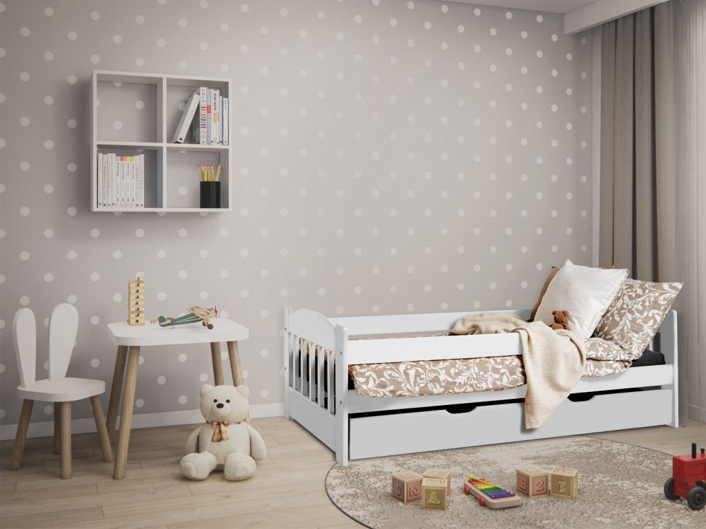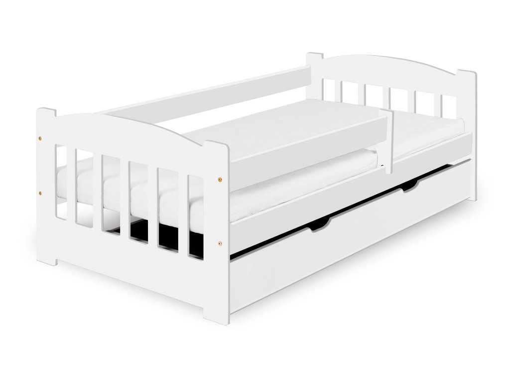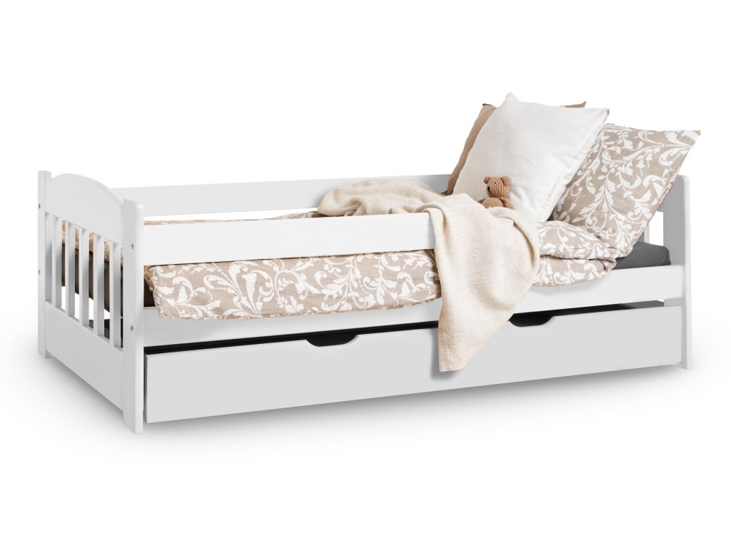 Egy gyönyörű, minőségi és praktikus ágyat keres a gyerekszobába. A STAS fehér fából készült gyerekágy 80x160 cm tökéletes választás mindenkinek. A praktikus leesésgátló pihentető alvást biztosít gyermekének, Önnek pedig nyugodt éjszakákat, hogy gyermeke egy biztonságos leesésgátlós ágyban pihen. Nagy plusz, hogy az ágy egy kihúzható, négy keréken guruló ágyneműtartó tároló fiókkal rendelkezik, amely az ággyal azonos színű. Remekül használható az ágynemű, a játékok vagy a szezonális ruhák tárolására, így segít rendet tartani a szobában.