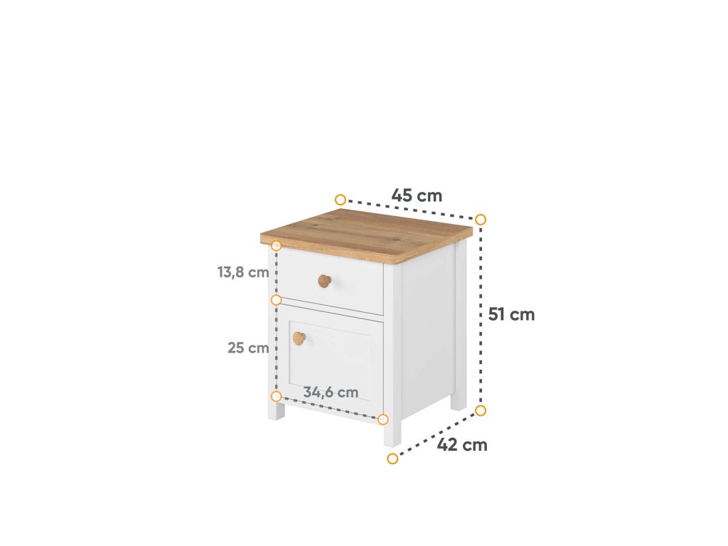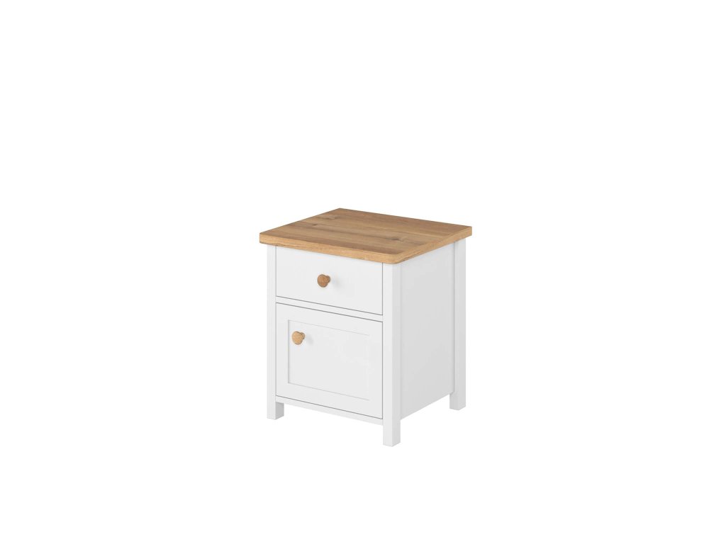 Stílusos STORY éjjeliszekrény, amely időtálló designnal és szép színkombinációval rendelkezik. Az éjjeliszekrény egy fiókkal és egy egyajtós szekrénnyel rendelkezik. A tetejére elhelyezheti az éjjeli lámpát vagy az éppen olvasott könyvét, mobilját.