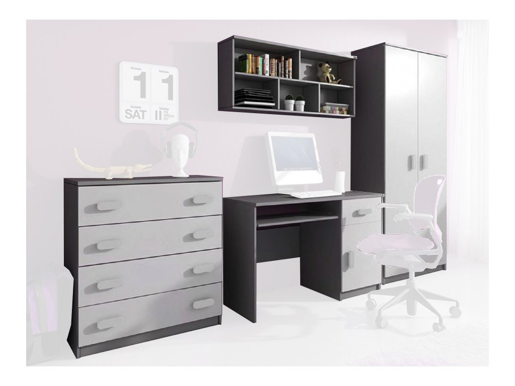 A SVEND szekrénysor a következő bútordarabokat tartalmazza: íróasztal, komód, ruhaszekrény és polc.