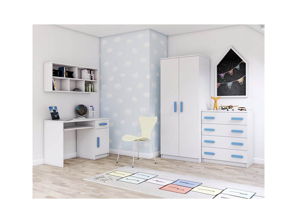 Időtálló dizájn és stílusosság jellemzi ezt a szép szekrénysort. Ez a szekrénysor kék színű fogantyúkkal kiváló választás fiús szobába. A SVEND kollekció bútora együtt nő gyermekével.