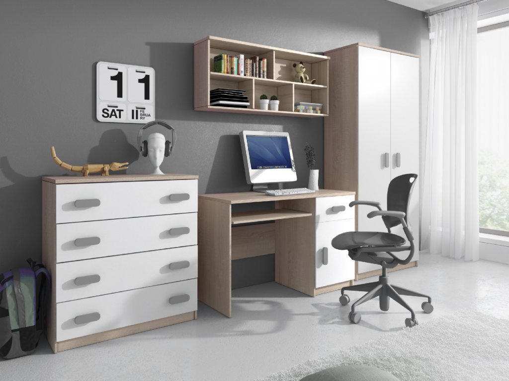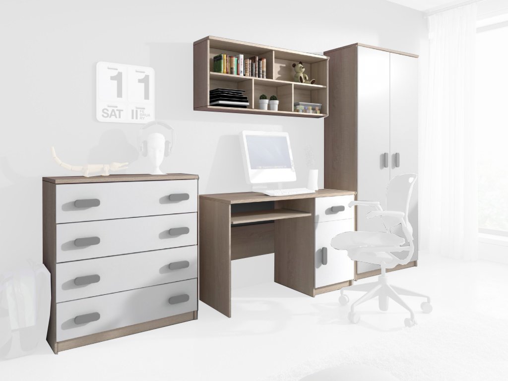 SVEND szekrénysor a következőkből áll: íróasztal, komód, ruhaszekrény és polc.