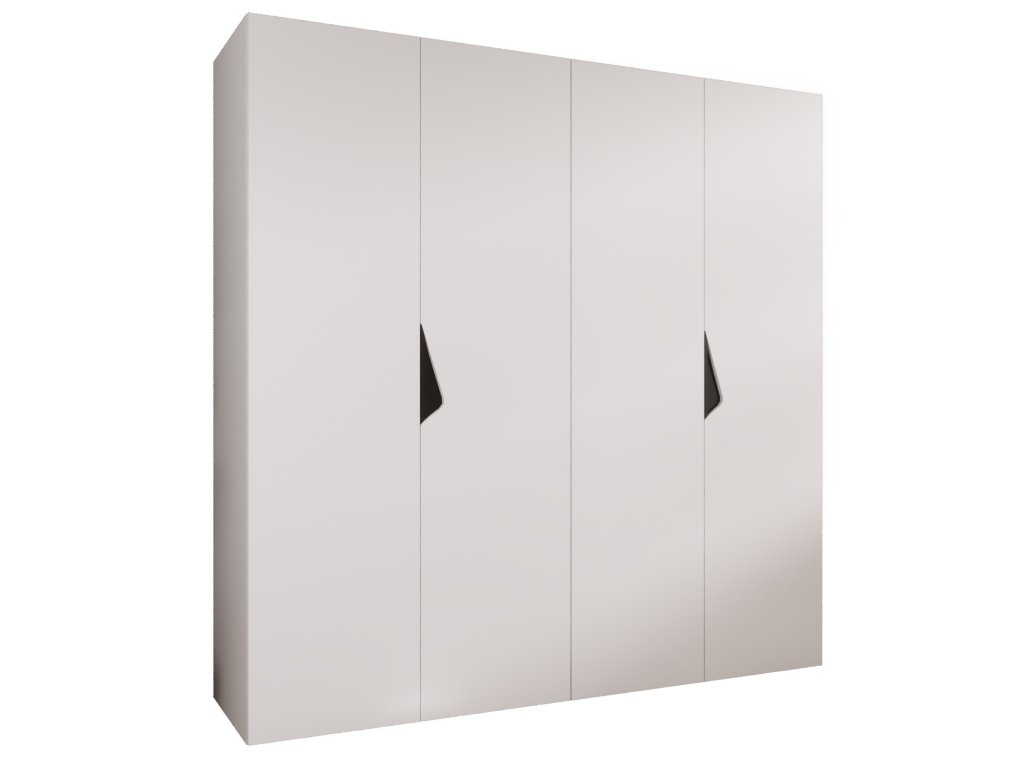Négyrészes fehér szekrény Sandi 1 lenyűgöző 200 cm szélességgel a végső megoldást kínálja azoknak, akik maximális rendet keresnek kompromisszumok nélkül a stílus terén. Ez a méret üres falat elegáns dizájnná alakít, amely a világos dekorációnak köszönhetően optikailag nem nehezíti a szobát, hanem éppen ellenkezőleg, világosabbá teszi azt. Az exkluzivitást a bemart részletek adják, melyekbe fekete fém fogantyúk vannak süllyesztve, szigorú és modern kontrasztot teremtve. Ez egy bútor, amely ötvözi a monumentalitást a finomsággal, így a modern hálószoba vagy tágas előszoba tökéletes középpontjává válik.