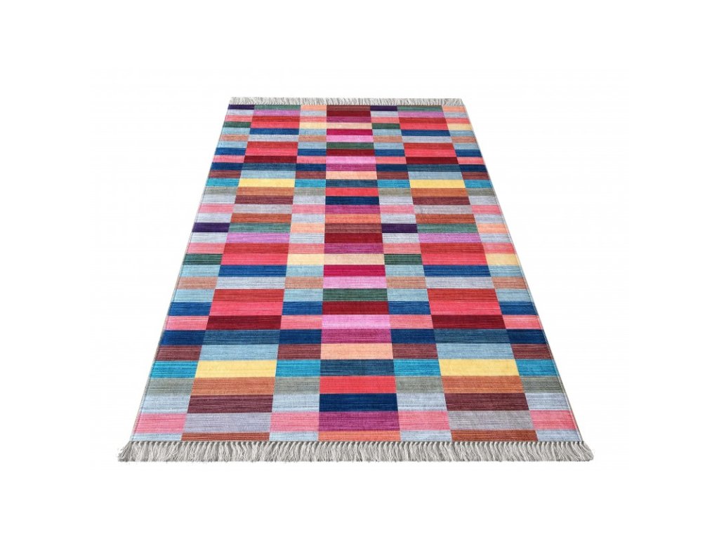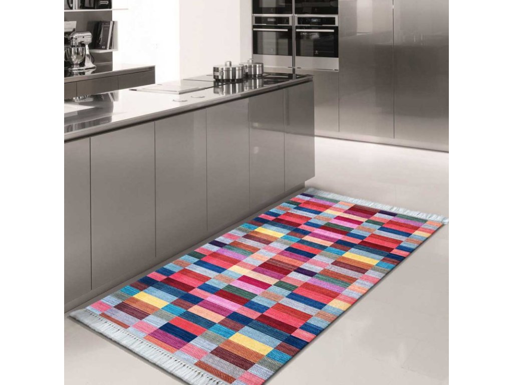 A BLAK színes szőnyeg kiválóan illik minden belső térbe. Elhelyezhető konyhába, fürdőszobába vagy akár előtérbe is. A gyártásakor minőségi anyagokat használtak fel, így ellenáll a deformációnak és a színváltozásoknak. A szőnyeg alsó része csúszásgátlós, így ideális a csúszós padlókra és felületekre. A szőnyeg mosógépben mosható, ami megkönnyíti a tisztán tartását. A sokszínű szőnyeg geometrikus mintával díszített, így teljes mértékben egyedivé varázsolja a szobát.