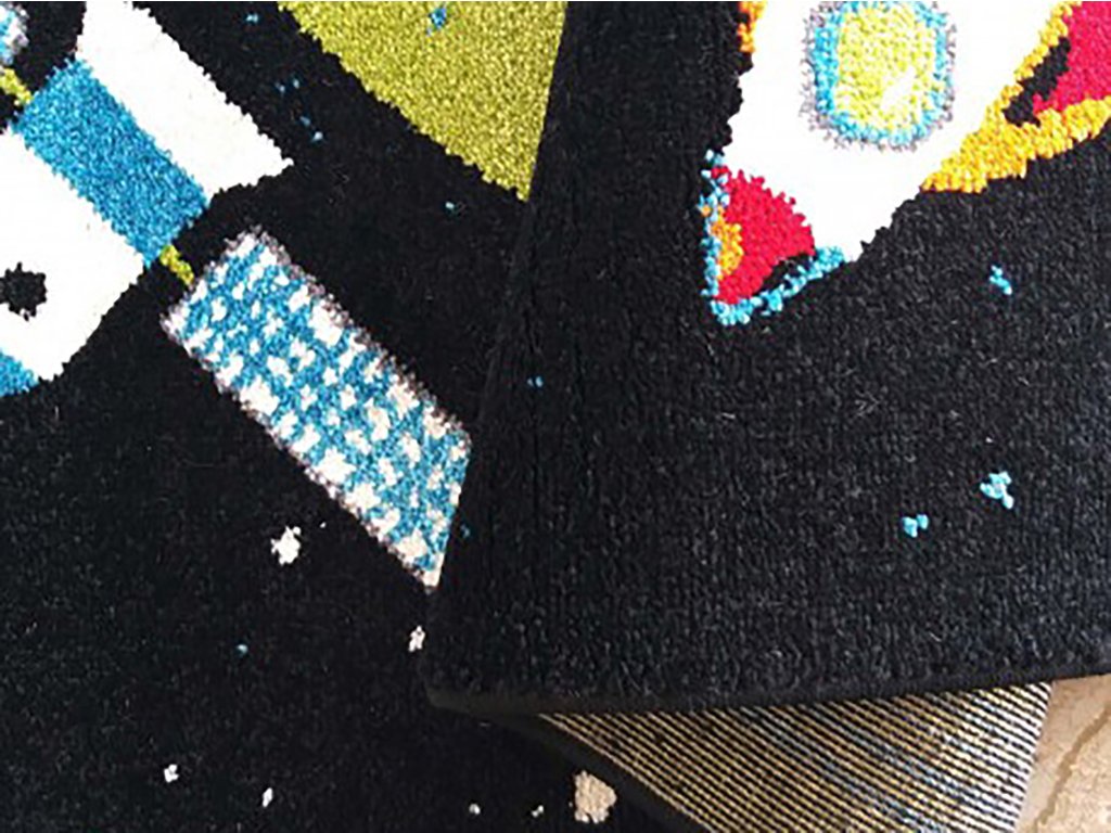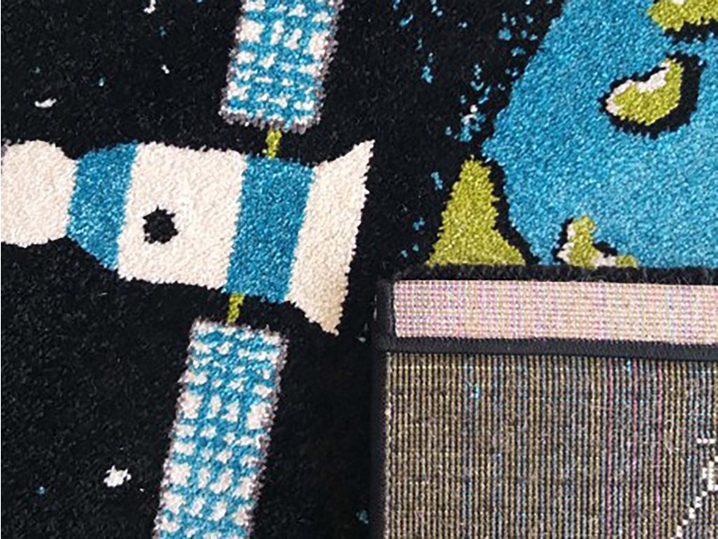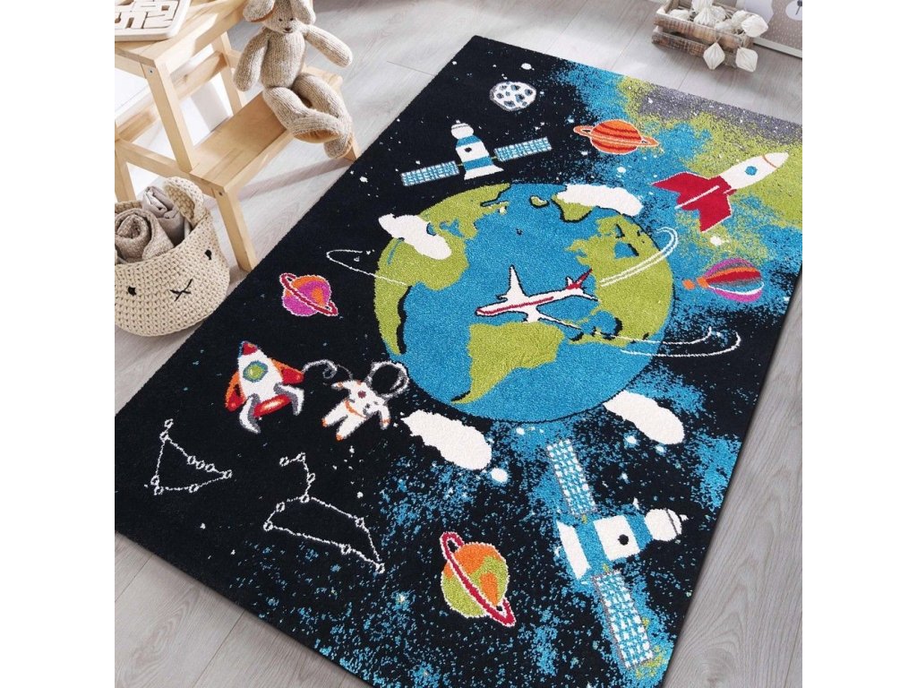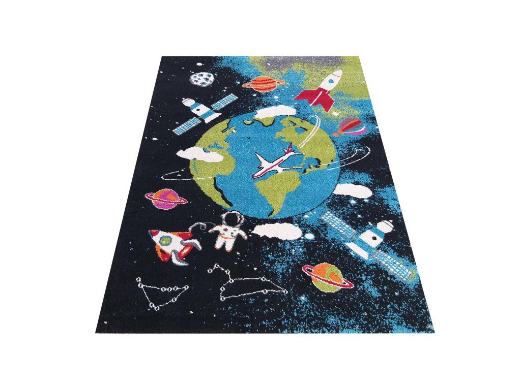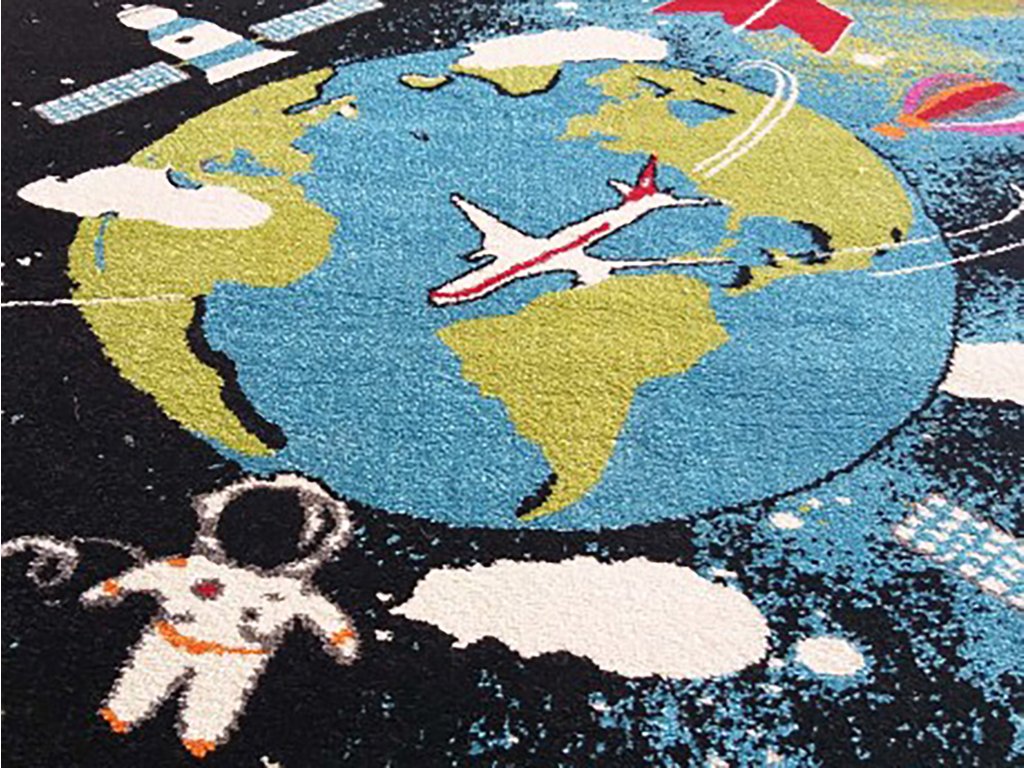 Világűr mintás gyerekszőnyeg, amely minden űr iránt rajongó gyerkőc álma. Minőségi 100 % polipropilén Heat Set Frisé. A gyerekszoba szőnyeg nagyon kellemes tapintású és könnyen tisztán tartható. A rugalmas szálaknak köszönhetően a szőnyeg nem deformálódik és ellenálló a kikopással szemben.