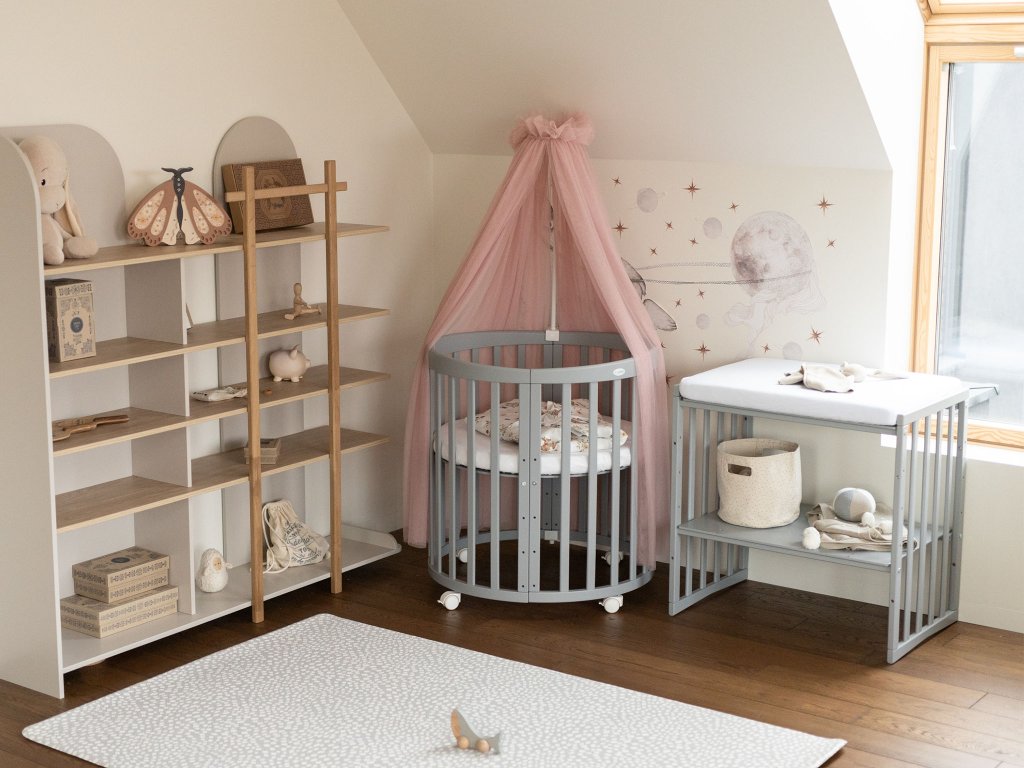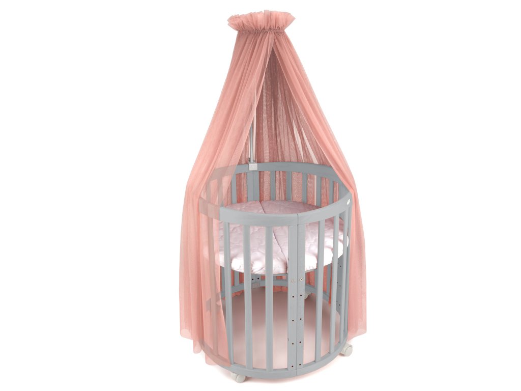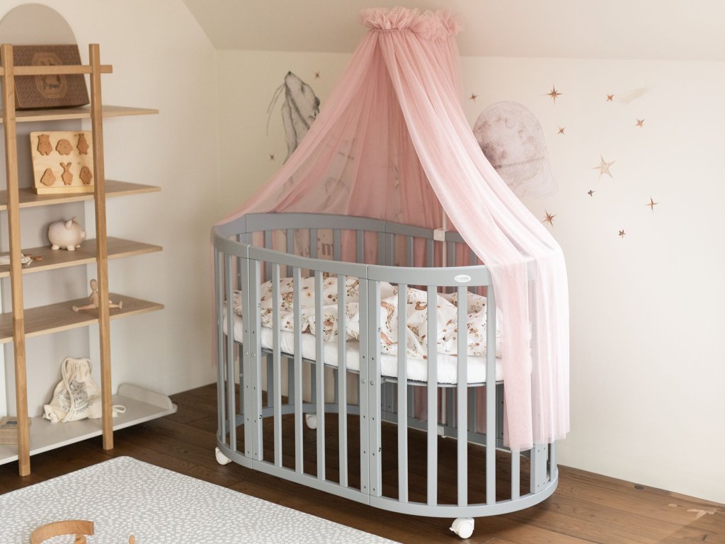 Szürke színben készült 7az1-ben növekvő kiságy gyönyörű rózsaszín tüll baldachinnal elérhető áron.