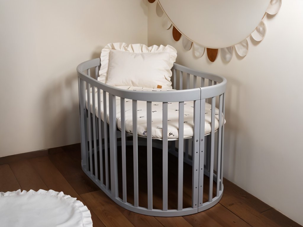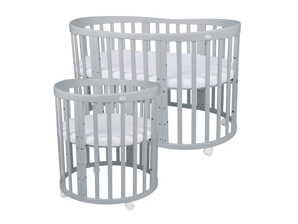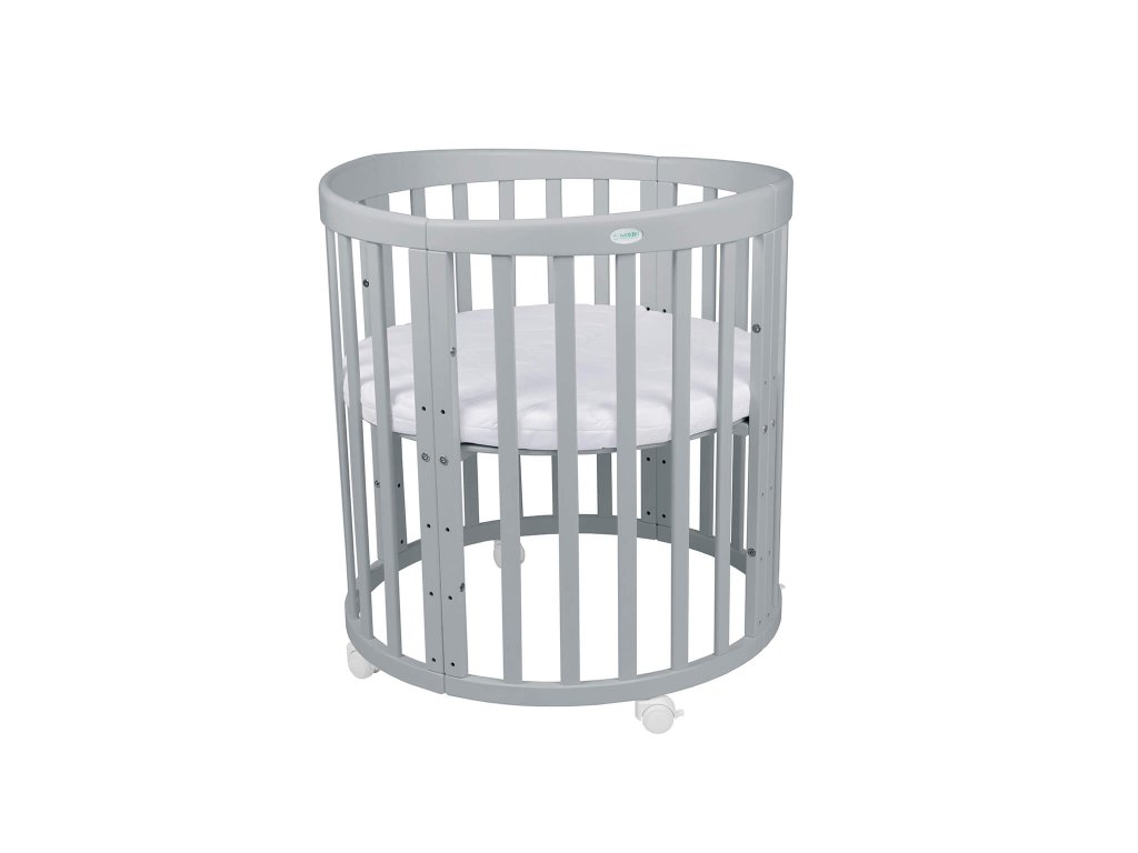 Szürke színű 7az1-ben kiságy - az ovális ágy különböző összeállítási lehetőségei biztosítják, hogy újszülött kortól egészen tízéves korig használható legyen. Az ágy összeszerelésének módja a gyermek korától és igényeitől függ. Az ágy olyan biztonsági funkciókkal is rendelkezik, mint például a görgőkön lévő biztonsági fékek. A háromrészes matrac T25-ös habból készült pamut huzattal. A huzat 30° C-on mosható. Az ágyrács 5 magassági pozícióba állítható. A legalacsonyabb 7 cm, ebben a pozícióban járókaként használható. A legmagasabb pozíció pedig 49 cm. Amennyiben a gumis görgőket felszereli az ágyra az ágyrács magassága a legmagasabb pozícióban 55 cm lesz.