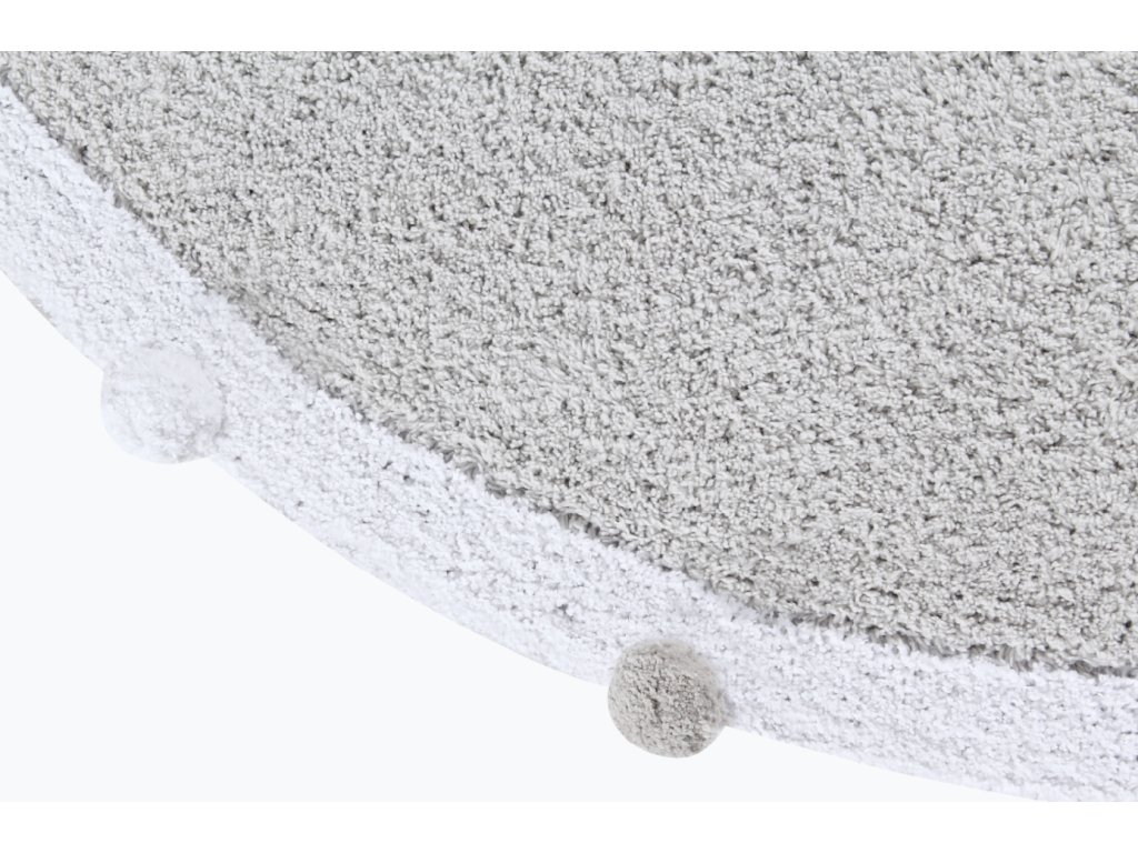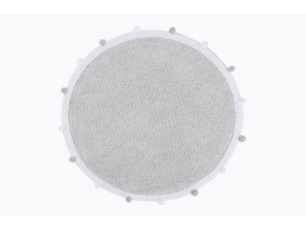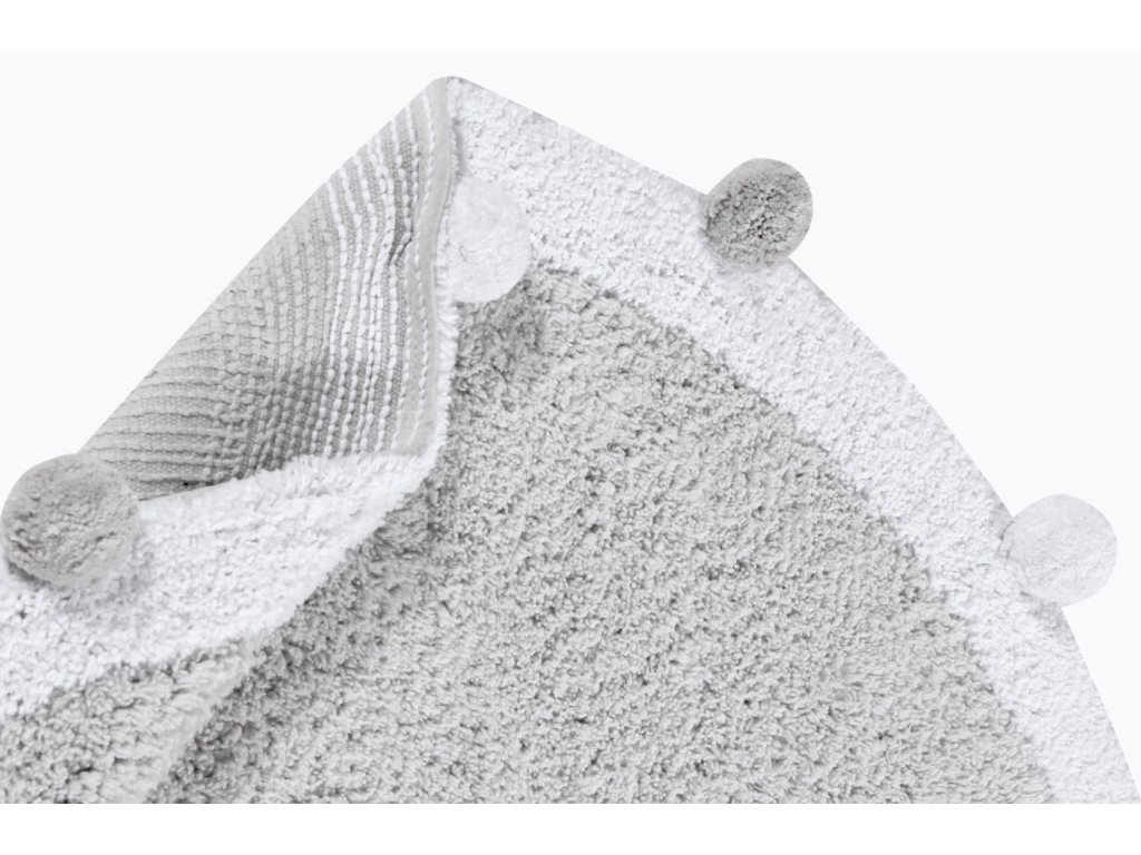 BUBBLY 120x120 gyerekszőnyeg egy szürke szőnyeg fehér szegéllyel és a szélén pompomokkal. 100% pamutból készült. A szőnyeg az elegáns és finom pasztell színeinek köszönhetően tökéletesen illik egy kislány vagy egy kisfiú szobájába is. A szőnyeg kézzel készült, és előállítása során csak természetes színezőanyagokat használtak, ezért teljesen biztonságos a gyermekei számára. A szőnyeg többféle tanúsítvánnyal rendelkezik, úgy, mint ISO 9001, ISO 14001 és ISO 18001 és AITEX, melynek köszönhetően biztosak lehetnek benne, hogy nem ártalmas a felhasználó egészségére és biztonságára. A felhasznált pamutnak köszönhetően a szőnyeg könnyű, rugalmas és nagyon puha, ideális minden gyerekszobába. Otthonossá és modernné varázsolja a gyerekszobát, továbbá tompítja a gyerekek rohangálása közben keletkező zajt.