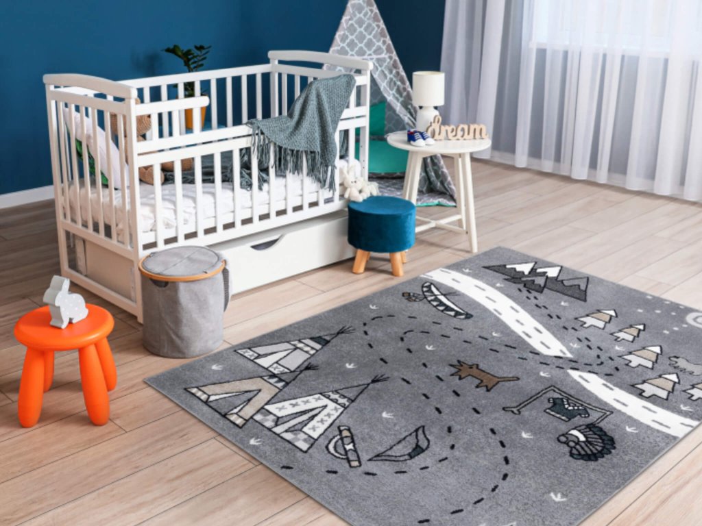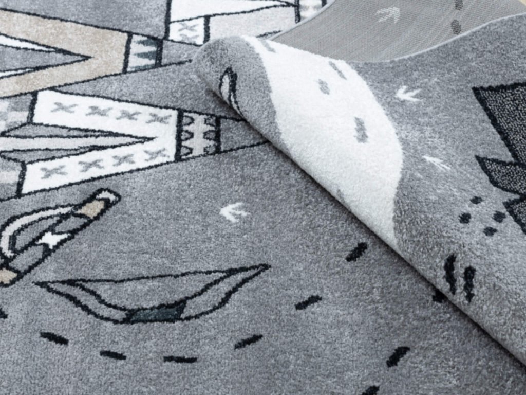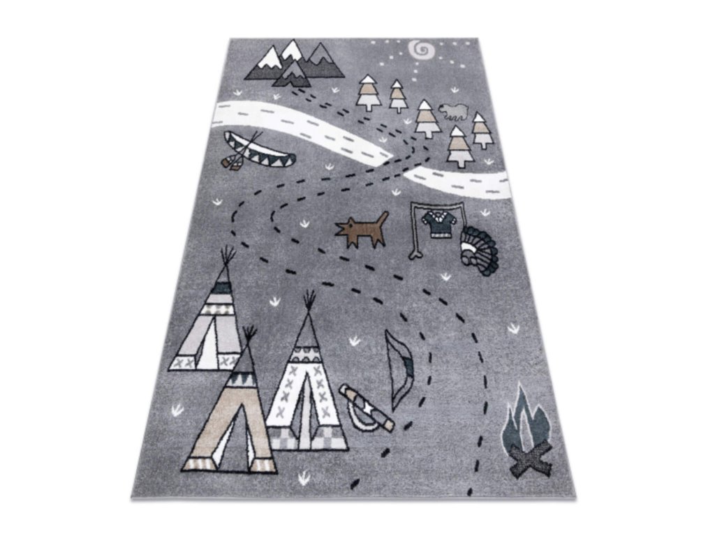 Szürke színben készült aranyos állat mintás gyerekszőnyeg, amely egy erdőn és tisztáson keresztül vezető utat ábrázol, amely mellett még indián falu is látható. A praktikus közlekedés szőnyeg tökéletes választás minden gyerekszobába, főleg a fiús gyerekszobákba a szürke színe miatt. Minőségi 100 % polipropilénből készült, amely megvédi a gyerekeket a hideg padlótől. 1800 g/m2 sűrűségű Soft Frisé típusú 8 mm magas szálainak köszönhetően padlófűtéshez is megfelelő. A közlekedés mintás gyerekszoba szőnyeg nagyon kellemes tapintású, puha és könnyen tisztán tartható.