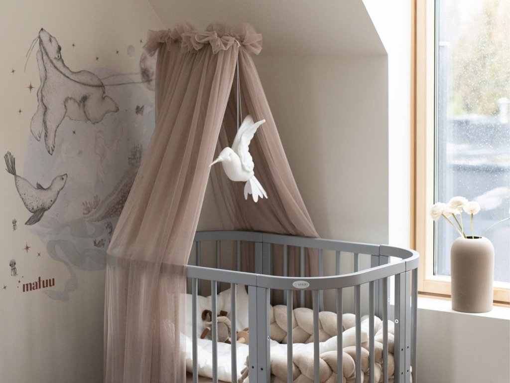 Finom tüll baldachin a növekvő 7 az 1-ben babaágyhoz, amely ovális és szögletes kivitelben is kapható. A baldachinok, gyerek ágyneműhuzatok és lámpák kiváló kiegészítői a gyerekszobának. A baldachint a kiságy fölé egy fém állvány segítségével szerelheti fel, amely a csomagban található. Ez az elegáns kiegészítő a gyerek növekvő kiságyhoz finom fátyolszerű tüll anyagból készült, amely 30°C-on mosható. A baldachint mosás után ajánlott felakasztani, hogy saját súlya segítségével felvegye a megfelelő alakot és így szükségtelen a vasalás. A tüll baldachin több színben is kapható, ezért kiválaszthatja a legmegfelelőbbet a növekvő 7 az 1-ben kiságyhoz.