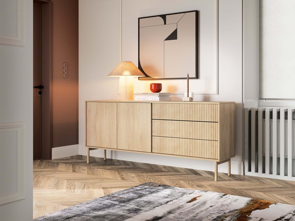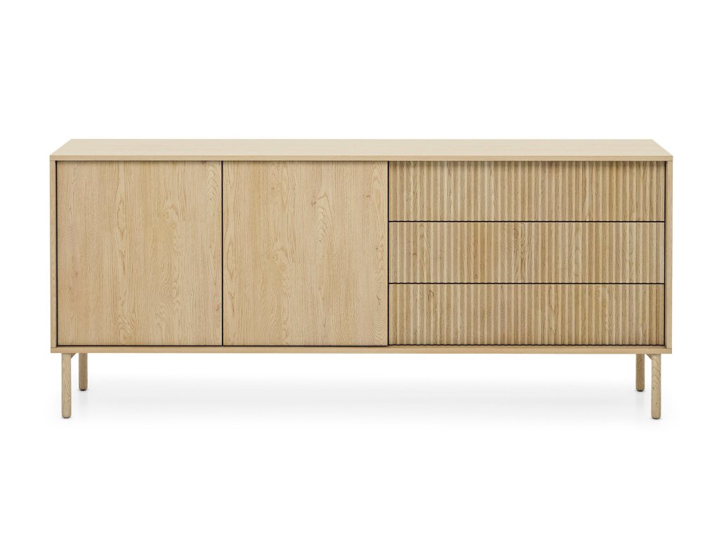 A 187 cm széles TAVO 2D3S komód egyszerre esztétikus és rendkívül praktikus bútordarab. Magas tömör fa lábakon áll, amelyek elegáns megjelenést kölcsönöznek a bútornak, és egyben megkönnyítik a bútor alatti takarítást is. Az MDF-ből készült előlapok, minőségi ABS élekkel kiegészülve stabil szerkezetet és hosszú élettartamot garntálnak.