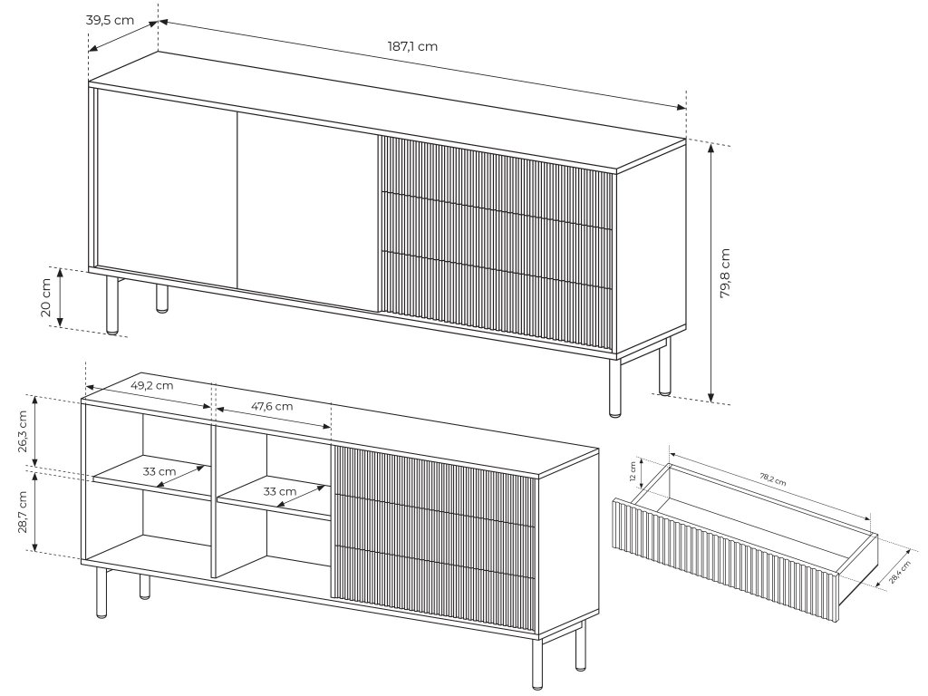- Fiókok mérete (SzéxMaxMé): 78,2 x 12 x 28,4 cm