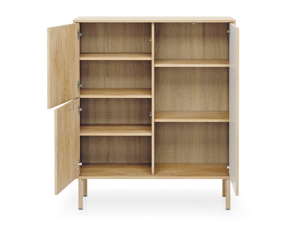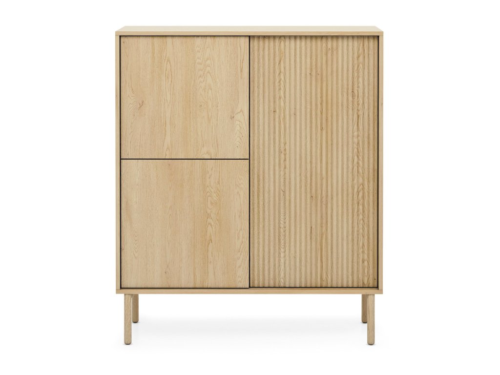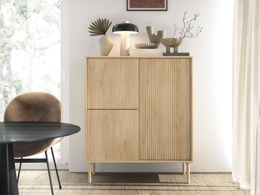 A TAVO 3D magas komód a japán ihletésű kinézetet ötvözi a modern kivitelezéssel. A komód stabil, magas tömör fa lábakon áll, amelyek könnyed megjelenést kölcsönöznek a bútornak, miközben biztos tartást garantálnak. Masszív szerkezetét barázdált MDF előlapok egészítik ki, gondosan megmunkált ABS élekkel, így a bútor elegáns és hosszú távon is strapabíró lesz.