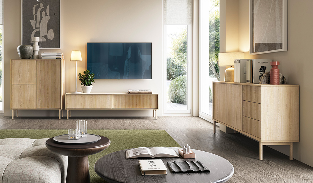 A TAVO nappali bútor garnitúra a modern design és a praktikus funkciók kombinációját nyújtja. A cremona tölgy szín meleg, barátságos és természetes hangulatot teremt majd az otthonában. Minden bútorelem minőségi anyagokból készül, elsősorban strapabíró MDF bútorlapból, amelyet elegáns fa lábak és látványos bordázott előlapok egészítenek ki. Ezek együtt biztosítják a bútorcsalád egyedi, mégis időtálló megjelenését. A mindennapi használatot az átgondolt részletek teszik igazán kényelmessé: a push-to-open fogantyú nélküli rendszerrel könnyedén nyithatók a szekrényajtók, a fiókok pedig golyóscsapágyas fióksíneken mozognak, így halkan és simán csúsznak.