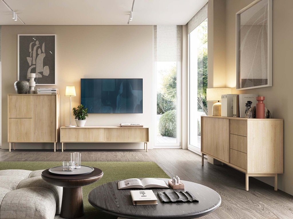 A TAVO nappali bútor garnitúra a modern design és a praktikus funkciók kombinációját nyújtja. A cremona tölgy szín meleg, barátságos és természetes hangulatot teremt majd az otthonában. Minden bútorelem minőségi anyagokból készül, elsősorban strapabíró MDF bútorlapból, amelyet elegáns fa lábak és látványos bordázott előlapok egészítenek ki. Ezek együtt biztosítják a bútorcsalád egyedi, mégis időtálló megjelenését. A mindennapi használatot az átgondolt részletek teszik igazán kényelmessé: a push-to-open fogantyú nélküli rendszerrel könnyedén nyithatók a szekrényajtók, a fiókok pedig golyóscsapágyas fióksíneken mozognak, így halkan és simán csúsznak. Már csak egy kényelmes ülőgarnitúra hiányzik, és kész is a tökéletes nappali.