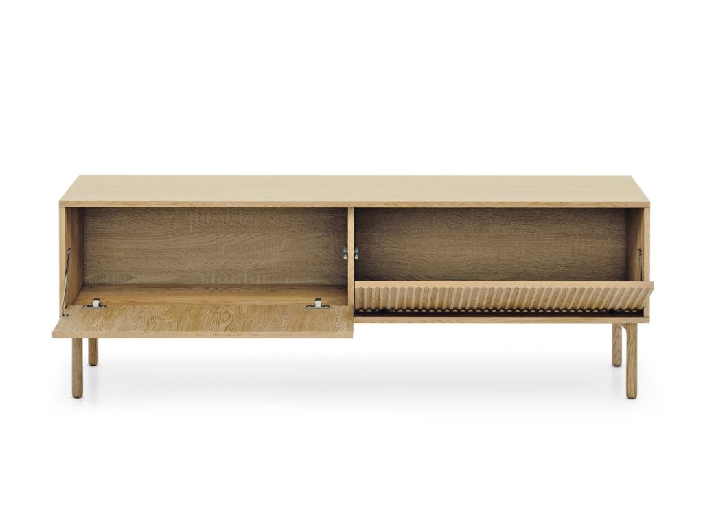 A lenyitható ajtók mögött tárolóhely található, amely bőséges helyet kínál az elektronikának, kiegészítőknek és minden olyan eszköznek, ami a televízióhoz tartozik. A push-to-open nyitási rendszernek köszönhetően a TV asztal nyitása igazán kényelmes – egy finom érintésre az ajtók simán kinyílnak, így nincs szükség a hagyományos fogantyúkra. A cremona tölgy szín természetes és modern összhatást teremt. Letisztult formája és praktikus belső elrendezése miatt ideális választás a nappaliba: nemcsak a televíziónak biztosít helyet, hanem elegáns módon segít elrejteni mindazt, amit nem szeretne szem elől tartani.