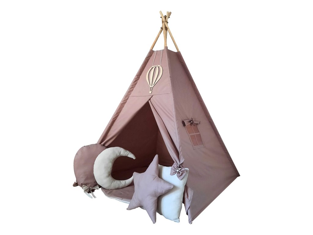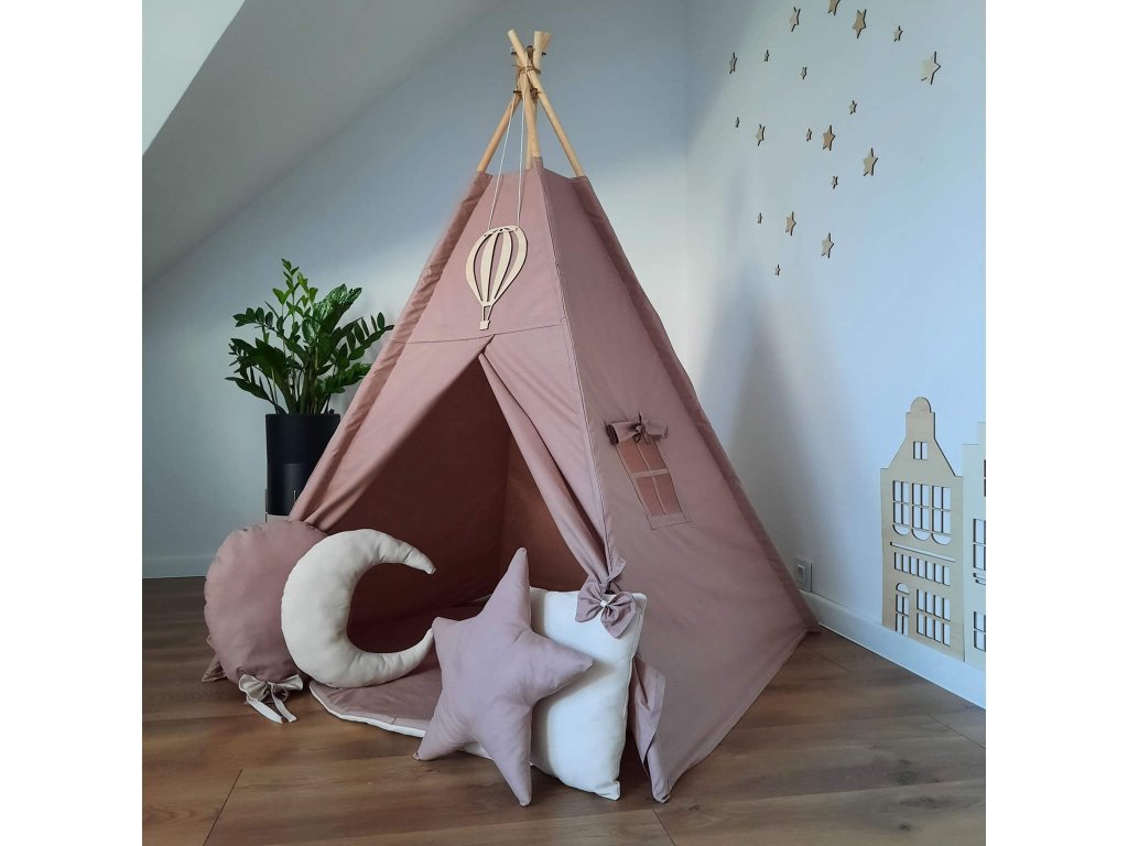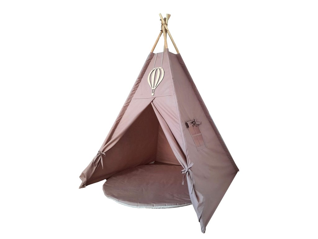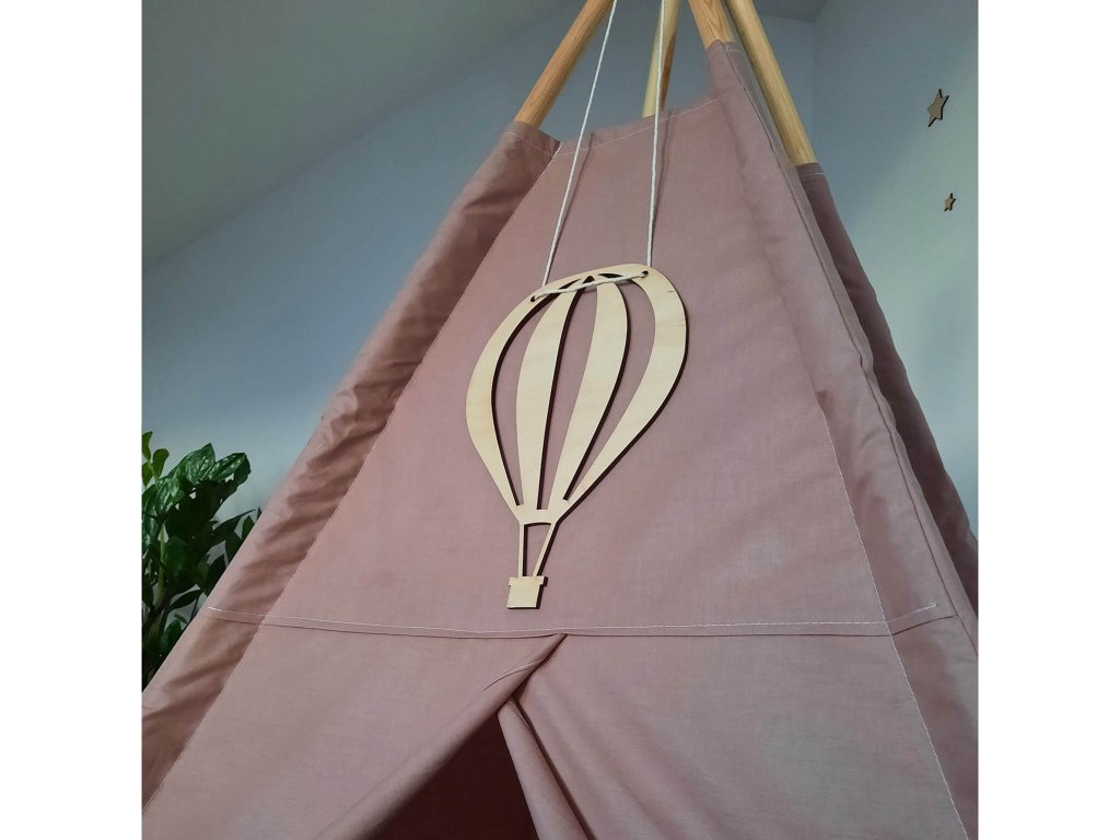 A Teepee indián sátor 4 párnával, szigetelő alátéttel (2 cm vastag), egy fa légballon dísszel, natúr borovi fenyőből készült tömör fa rudakkal és egy stabilizátorral rendelkezik, amely növeli a konstrukció biztonságosságát.