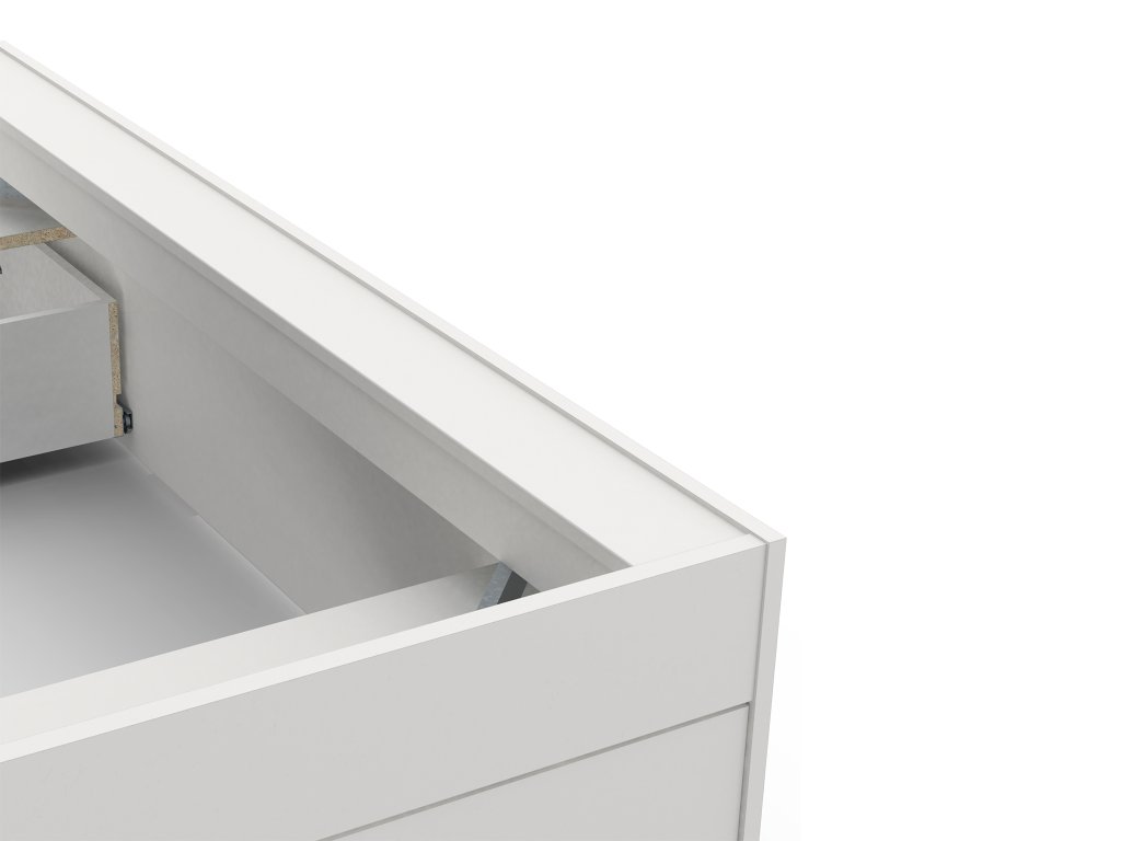 Az ágy 18 mm vastag, kiváló minőségű laminált bútorlapból készült, precíz felületkezeléssel és élzárással. Az ágy kivehető belső deszkalappal is rendelkezik, amely lehetővé teszi a fekhely hosszának méretre igazítását – a deszkalap behelyezésével egy 140x190 cm-es fekhelyet kap, nélküle pedig egy 140x200 centimétereset. Mindkét esetben 140x200 cm ágyrácsra van szükség.