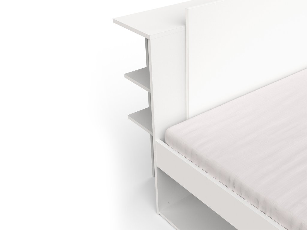 Nemcsak minimalista megjelenésével hódít, hanem bőséges tárolóhelyével is: az alsó részben két tágas ágyneműtartó tároló fiók található, míg a háttámla praktikus beépített könyvespolccal rendelkezik. Tökéletes könyvek, dekorációk, az ébresztőóra vagy bármi más tárolására, amit szeretne a keze ügyében tudni. Az ágy 18 mm vastag, kiváló minőségű laminált bútorlapból készült, precíz felületkezeléssel és élzárással.
