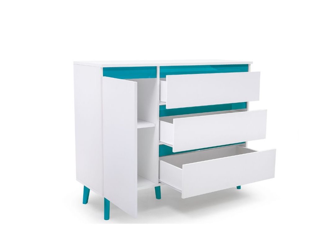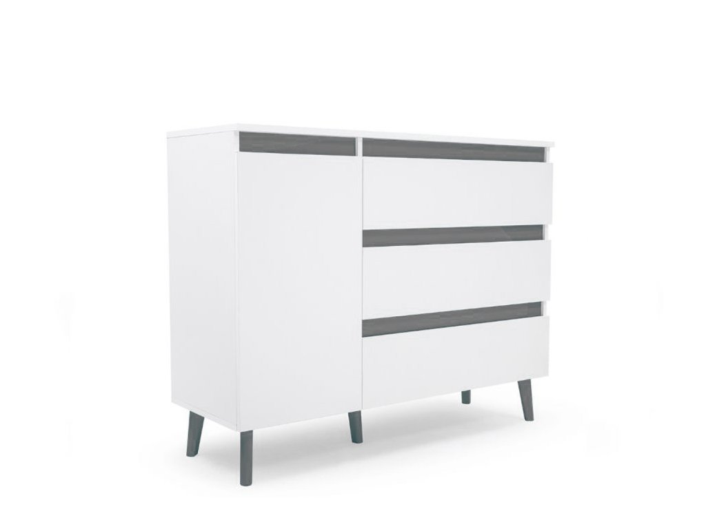 A stílusos komód ajtóval és három tágas fiókkal elegendő tárolóhelyet biztosít ruházatra és egyéb dolgokra.