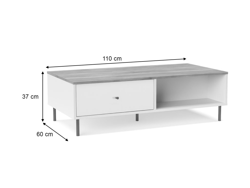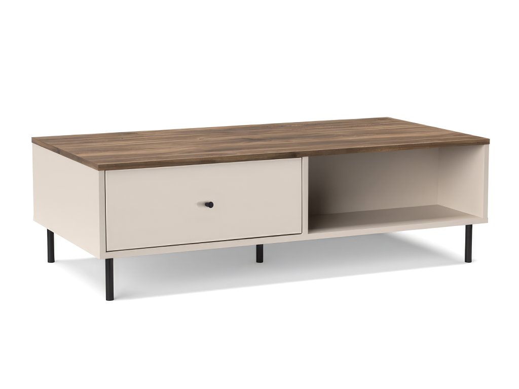 Az asztal praktikus tárolóhelyet kínál zárt szekrények formájában, amelyek lenyitható frontokkal rendelkeznek – tökéletesek apróságok, magazinok vagy távirányítók elrejtésére, hogy kéznél legyenek, de ne legyenek szem előtt. A nyitott rész légiességet ad, és helyet biztosít dekorációknak vagy könyveknek, amelyek még jobban kiemelik a nappali karakterét. A tiszta vonalvezetés és a fekete fogantyúk a minimalista megjelenést hangsúlyozzák, miközben a karcsú fekete fém lábak könnyedséget, stabilitást és modern csavart kölcsönöznek az asztalnak.