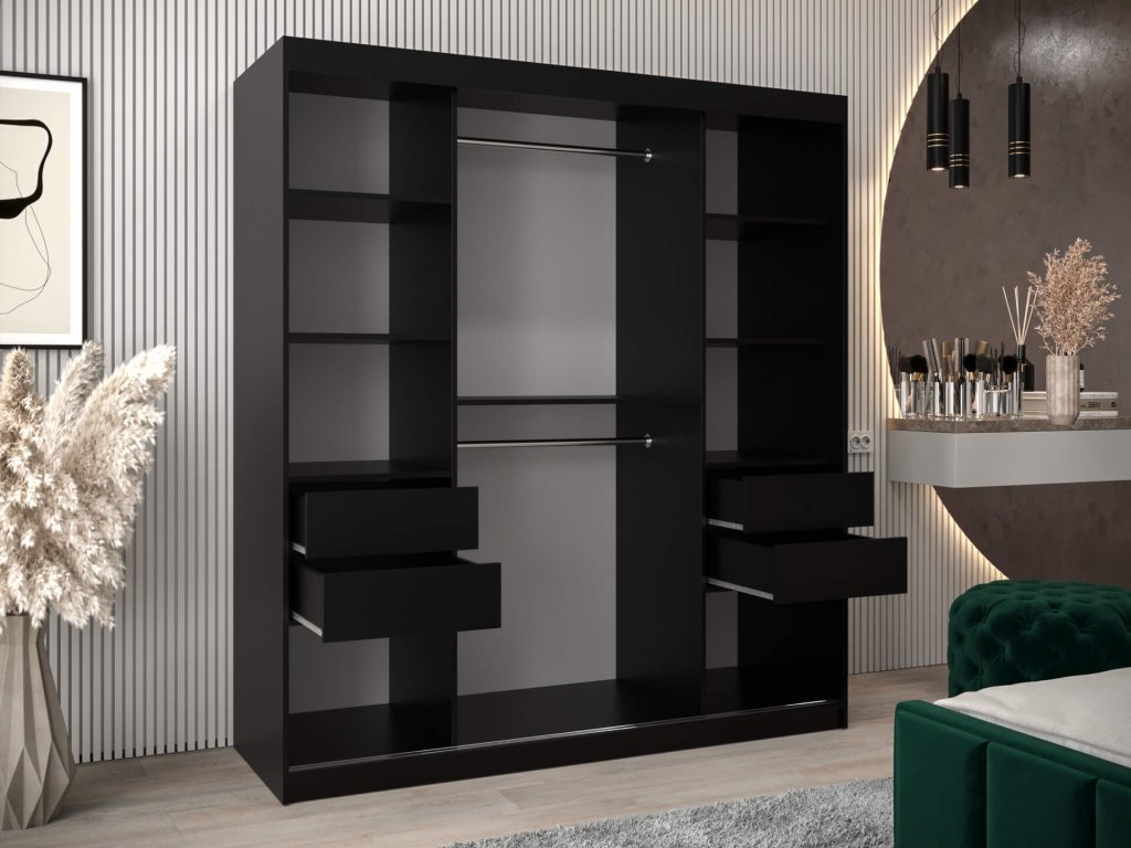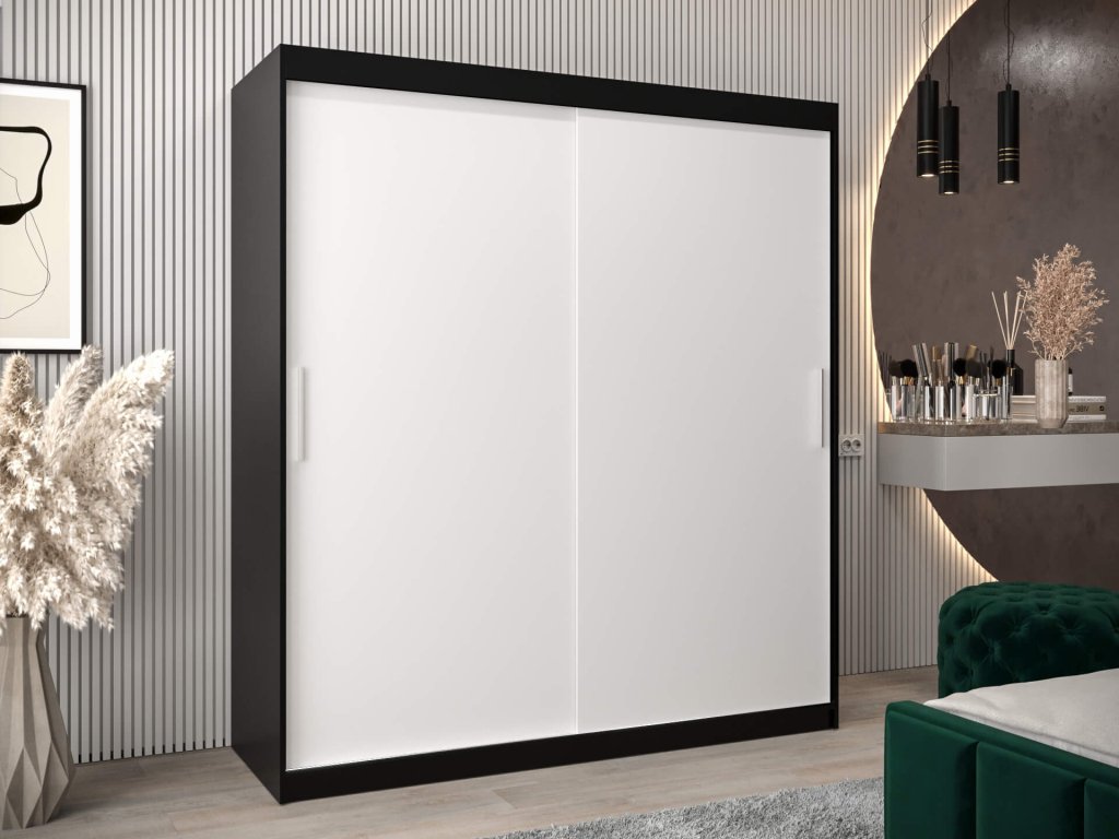 Különleges fekete - fehér színváltozatban készült praktikus TOKYO gardróbszekrény, amely rengeteg tároló helyet biztosít. A szekrény két méretben kapható: 200x200 és 200x180 cm. A ruhásszekrény remek belső kialakítással és gyönyörű designnal rendelkezik. Három részre osztott: a közepén két akasztórúd, a két szélében pedig polcok találhatók. A két akasztórúd helyet biztosít a ruháknak és kabátoknak. Minőségi laminált 16 mm vastag bútorlapból készült, melynek szélei PVC furnérral vannak biztosítva. A ,,BIMAK“ tolórendszer biztosítja alumínium síneken a tolóajtók kényelmes kinyitását és becsukását. A garób tökéletes nemcsak a hálószobába, hanem a folyosóra vagy az előszobába is.