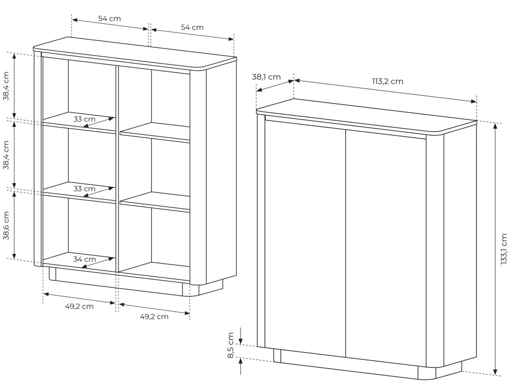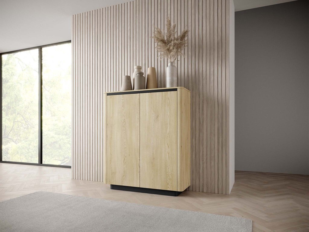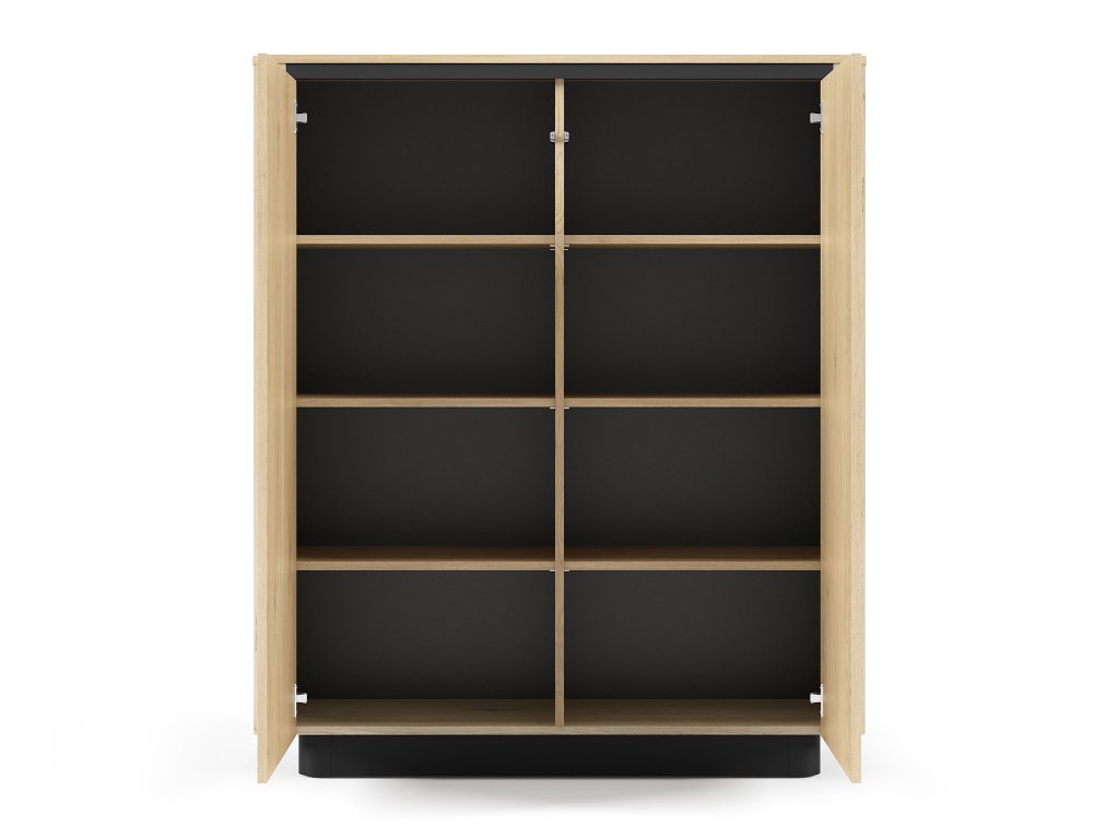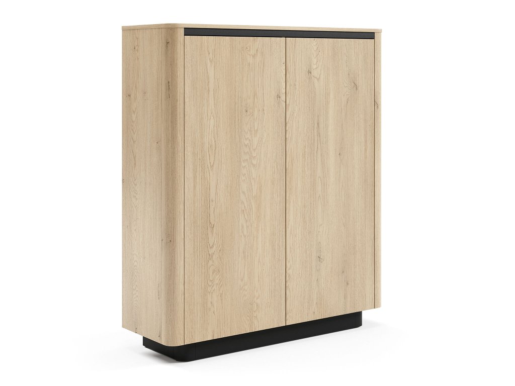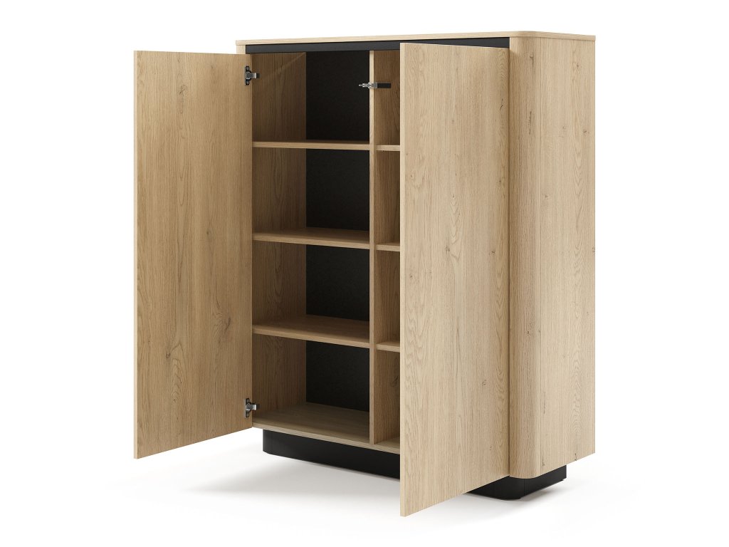 A TORRO 2D magas kétajtós komód egy elegáns és praktikus bútordarab, amely harmóniát és tárolóhelyet visz otthonába. Letisztult kinézete, továbbá a cremona tölgy és a fekete részletek kombinációja modern és időtálló megjelenést kölcsönöz neki. A két fogantyú nélküli ajtó mögött több polc is található, amelyek bőséges helyet biztosítanak az iratoknak, textíliáknak vagy egyéb kiegészítőnek. A finoman lekerekített élek és a fekete talpazat lágy, elegáns karaktert ad a bútornak. Nemcsak a nappaliban mutat jól, hanem a hálószobában vagy az előszobában is remekül kihasználható.