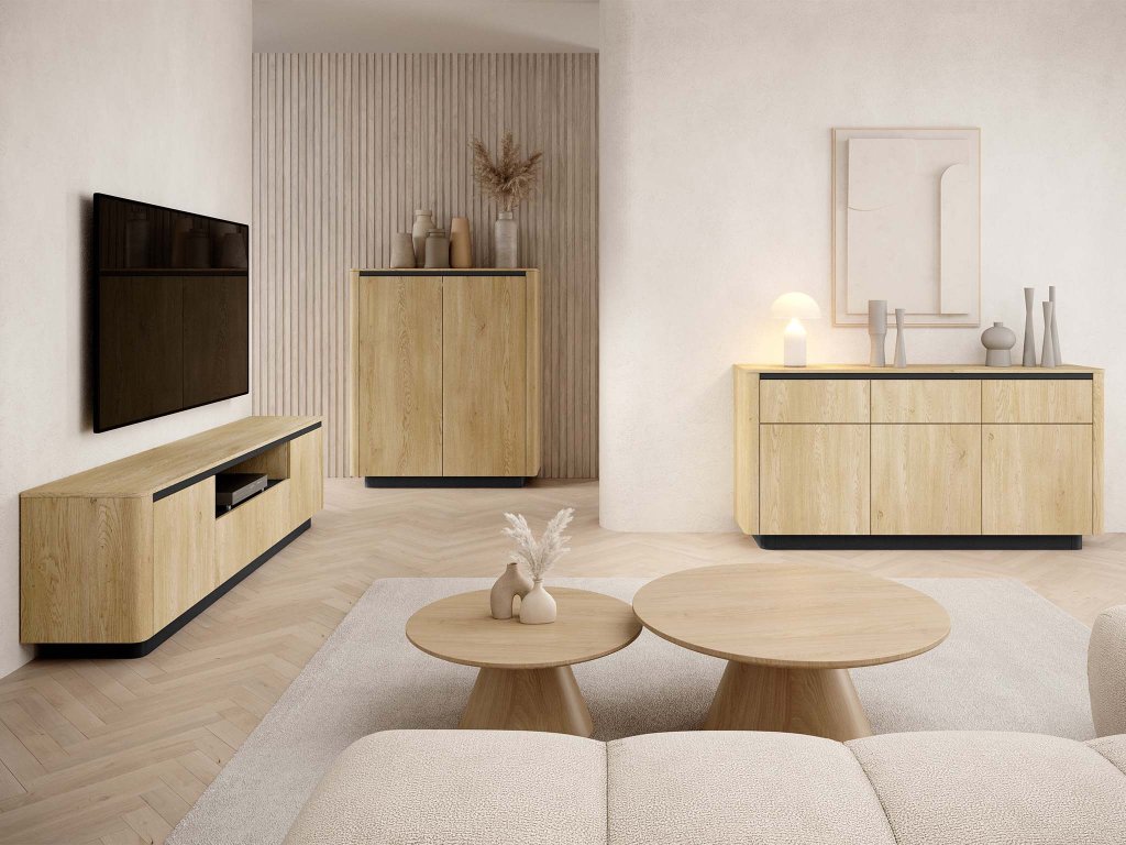 A TORRO nappali bútor garnitúra modern stílust és letisztult eleganciát visz majd a nappalijába, ahol a funkcionalitás és az elegancia kéz a kézben jár. A cremona tölgy szín a fekete részletekkel harmonikus kontrasztot alkot: egyszerre kelt természetes és luxusos hatást. A bútorcsalád meghatározó elemei a finoman lekerekített élek, amelyeket letisztult, geometrikus formák egészítenek ki, így a kollekció igazán egyedi megjelenést kap. A bútorok szett minőségi 16 mm vastag laminált faforgácslapból készül, amely ellenálló a karcolásokkal szemben. A széleket ABS élzárás védi, növelve ezzel az egyes darabok élettartamát. Az ajtó és fiókok modern, fogantyú nélküli push-to-open nyitórendszerrel működnek, így a kollekció minden eleme elegáns és minimalista benyomást kelt.