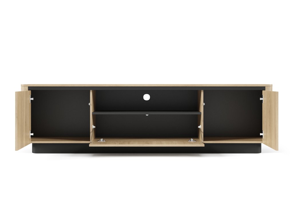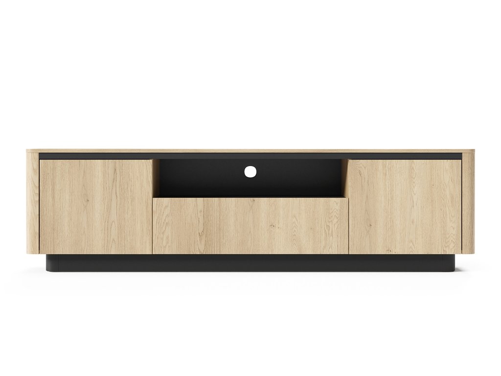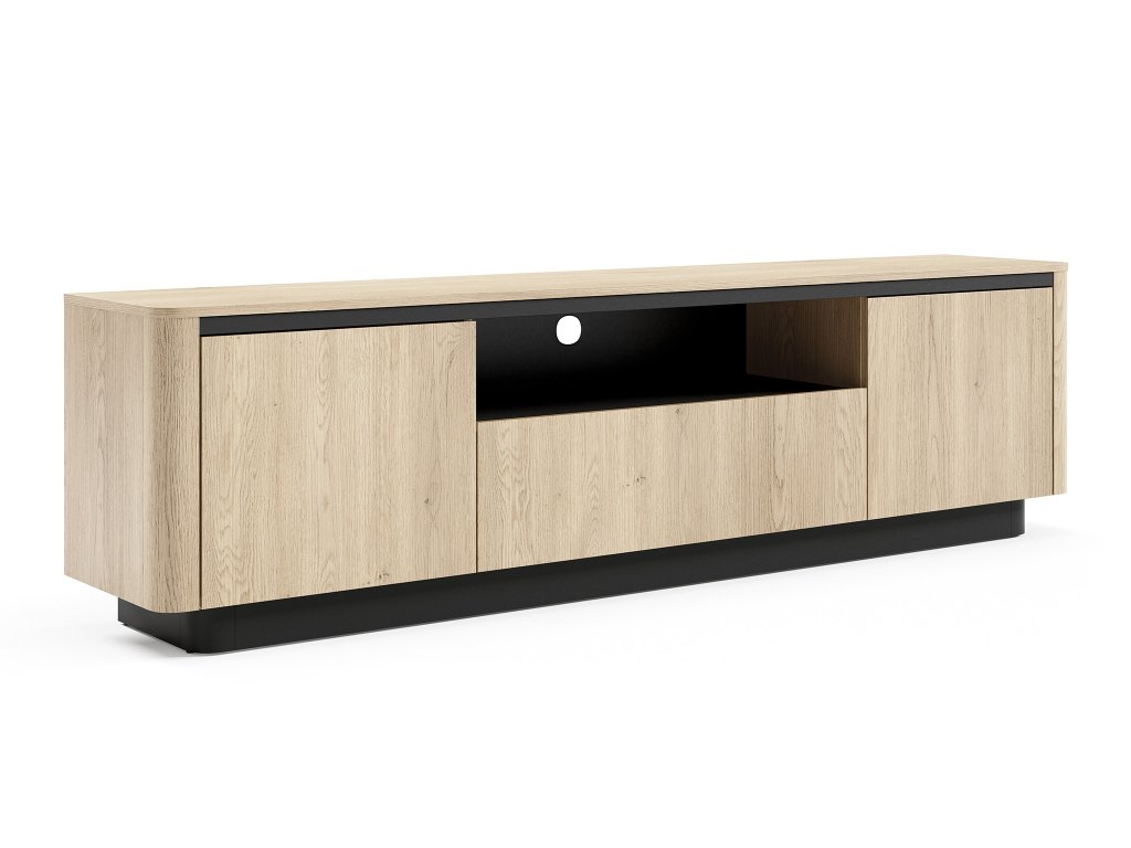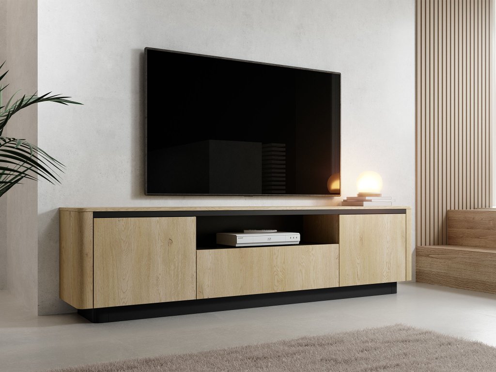A TORRO 3D tévés szekrény a praktikumot és a modern dizájnt ötvözi a Japandi stílus letisztult eleganciájával. A három ajtó mögött tágas tárolóhely található, ahol könnyedén elfér az elektronika, a kábelek vagy a tévéhez tartozó kiegészítők. A push-to-open nyitási rendszernek köszönhetően az ajtók fogantyú nélkül, egy finom érintésre nyílnak, így a bútor összképe letisztult és modern marad. A lágyan lekerekített élek és a fekete talpazat tovább erősítik a dizájn kifinomultságát. A teteje elegendő helyet biztosít a televíziónak, ugyanakkor a dekorációk számára is tökéletes.