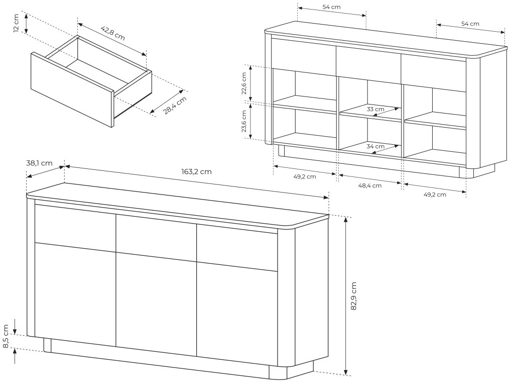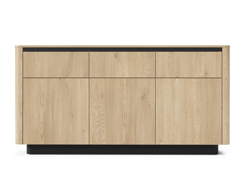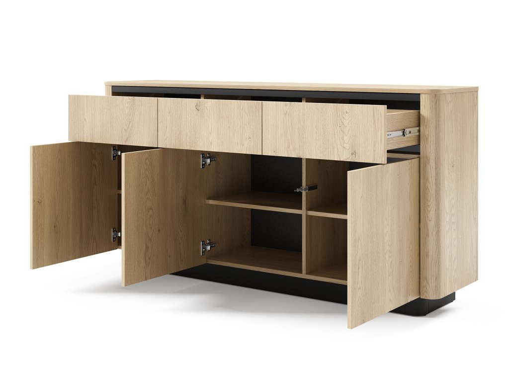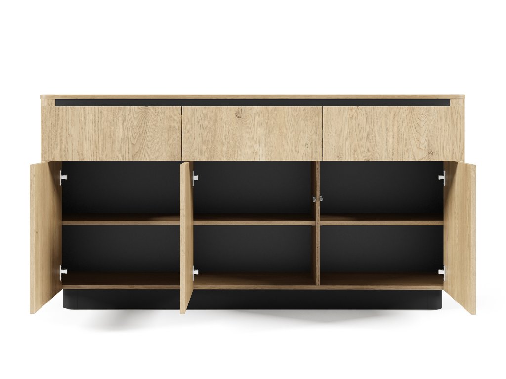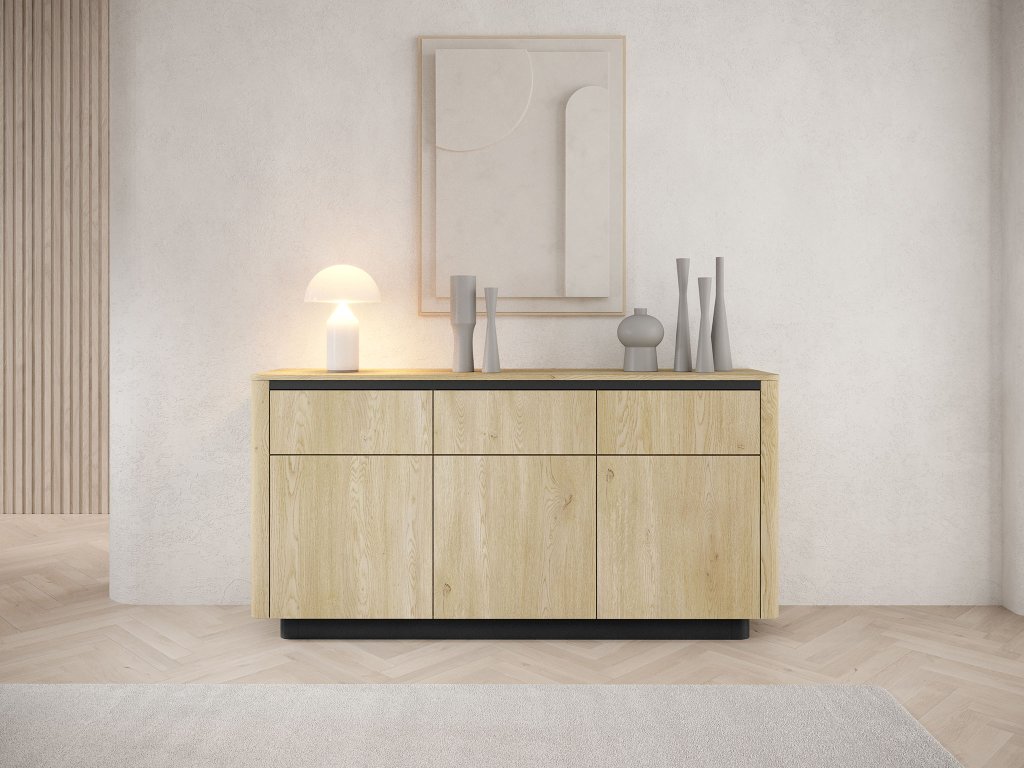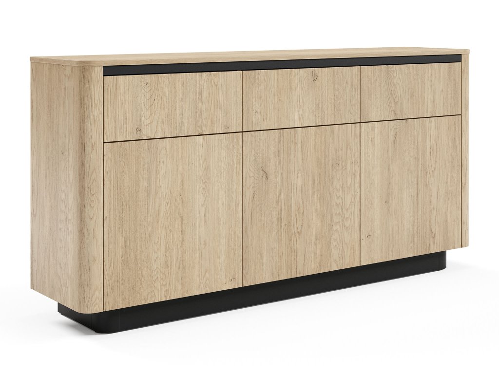 A TORRO 3D3S széles komód a modern otthon egyik legstílusosabb darabja lehet. Meleg cremona tölgy színe és a fekete részletek elegáns kontrasztja harmonikusan egyesíti a természetes hatást a letisztult, mai dizájnnal. A felső három fiók tökéletes helyet kínál a mindennapi apróságoknak, dokumentumoknak és textíliáknak, míg az alsó, három ajtó mögötti tágas polcos tárolórész gondoskodik arról, hogy minden nagyobb tárgy rendezetten, mégis diszkréten el legyen rejtve. A finoman lekerekített élek és a fekete talpazat lágy, elegáns karaktert ad a bútornak. Nemcsak a nappaliban mutat jól, hanem a hálószobában vagy az előszobában is remekül kihasználható.