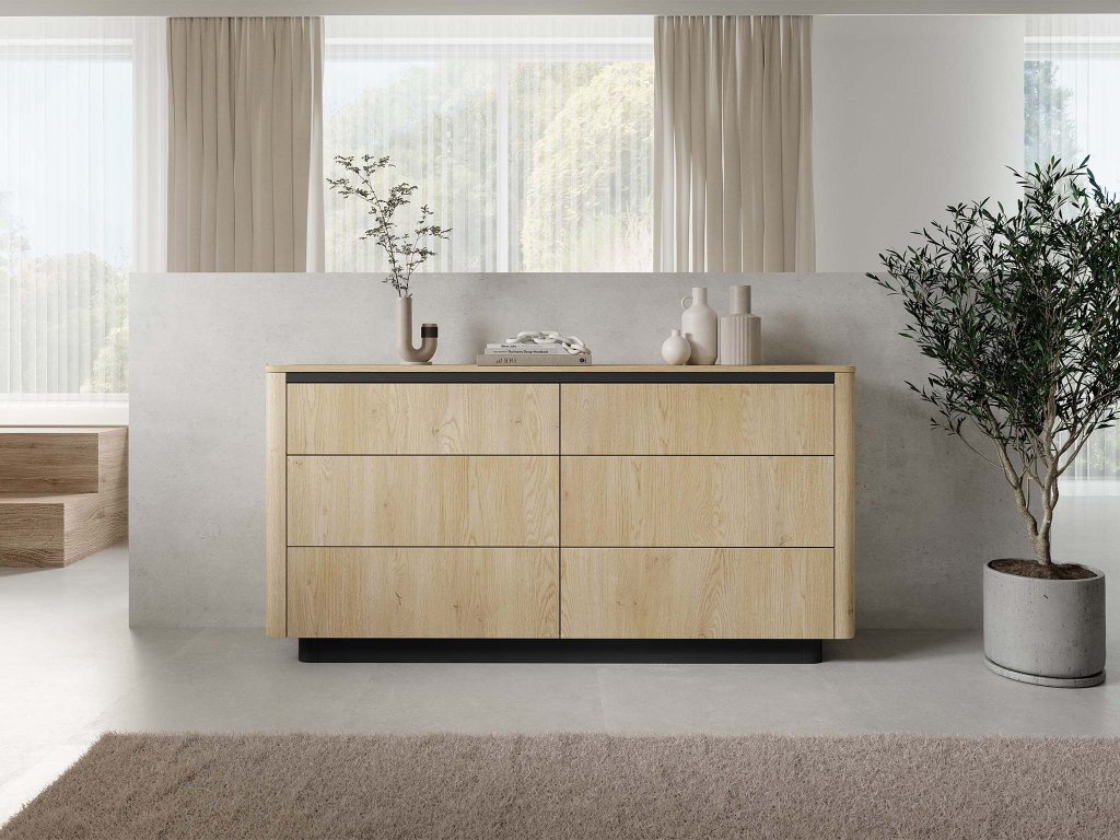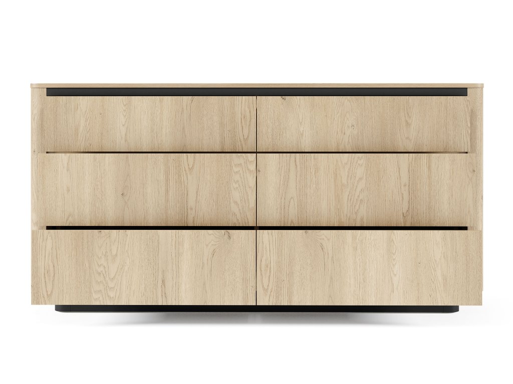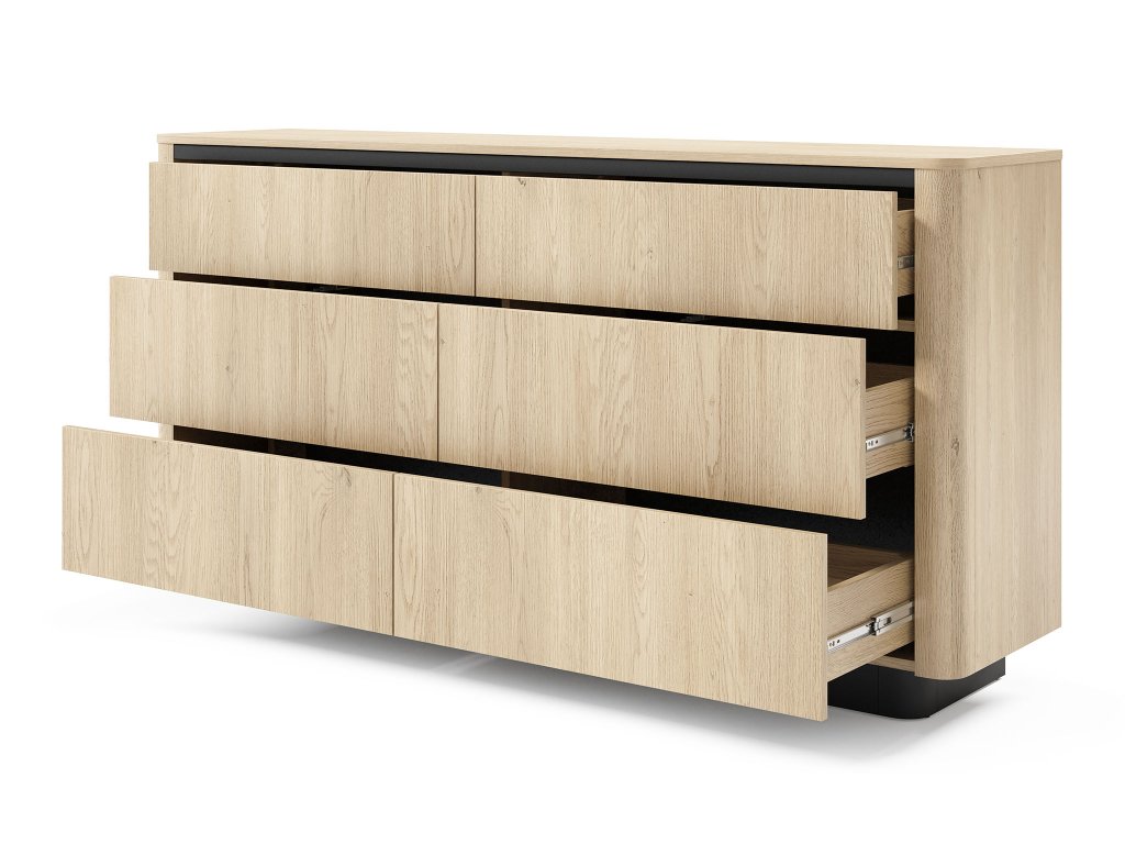 A TORRO 6S széles fiókos komód nagyon jó megoldás lehet minden otthonba. Választhatja a japandi stílusú vagy a minimalista belső terekbe is. Meleg cremona tölgy színe és a fekete részletek elegáns kontrasztja harmonikusan egyesíti a természetes hatást a letisztult. A hat fiók tökéletes helyet kínál a mindennapi apróságoknak, dokumentumoknak és textíliáknak. A finoman lekerekített élek és a fekete talpazat lágy, elegáns karaktert ad a bútornak. Nemcsak a nappaliban mutat jól, hanem a hálószobában vagy az előszobában is remekül kihasználható.