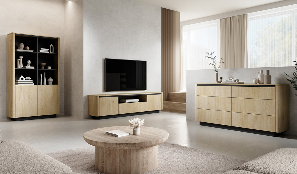 A TORRO nappali bútor garnitúra modern stílust és letisztult eleganciát visz majd a nappalijába, ahol a funkcionalitás és az elegancia kéz a kézben jár. A cremona tölgy szín a fekete részletekkel harmonikus kontrasztot alkot: egyszerre kelt természetes és luxusos hatást. A bútorok meghatározó elemei a finoman lekerekített élek, amelyeket letisztult, geometrikus formák egészítenek ki, így a kollekció igazán egyedi megjelenést kap.