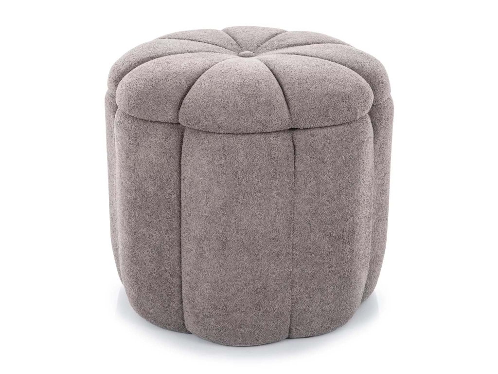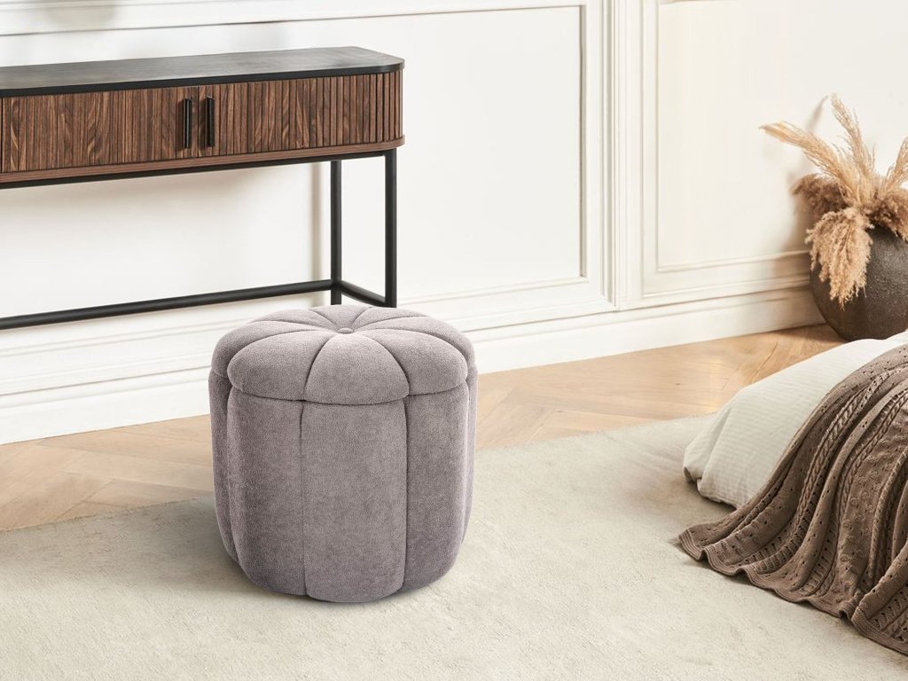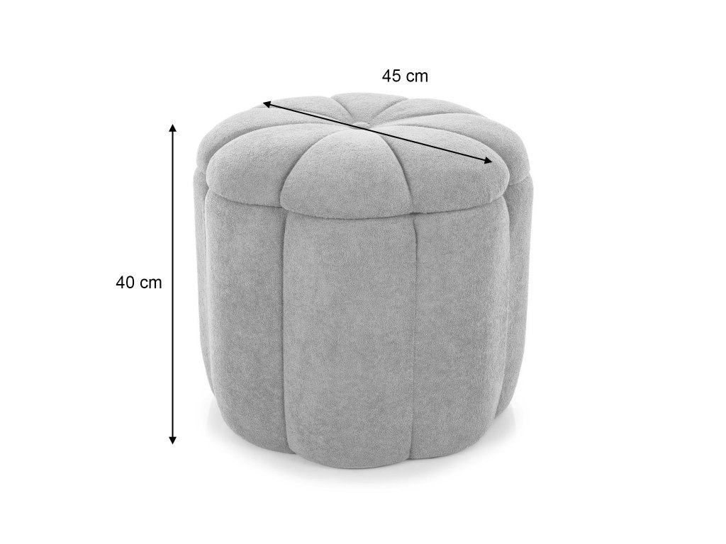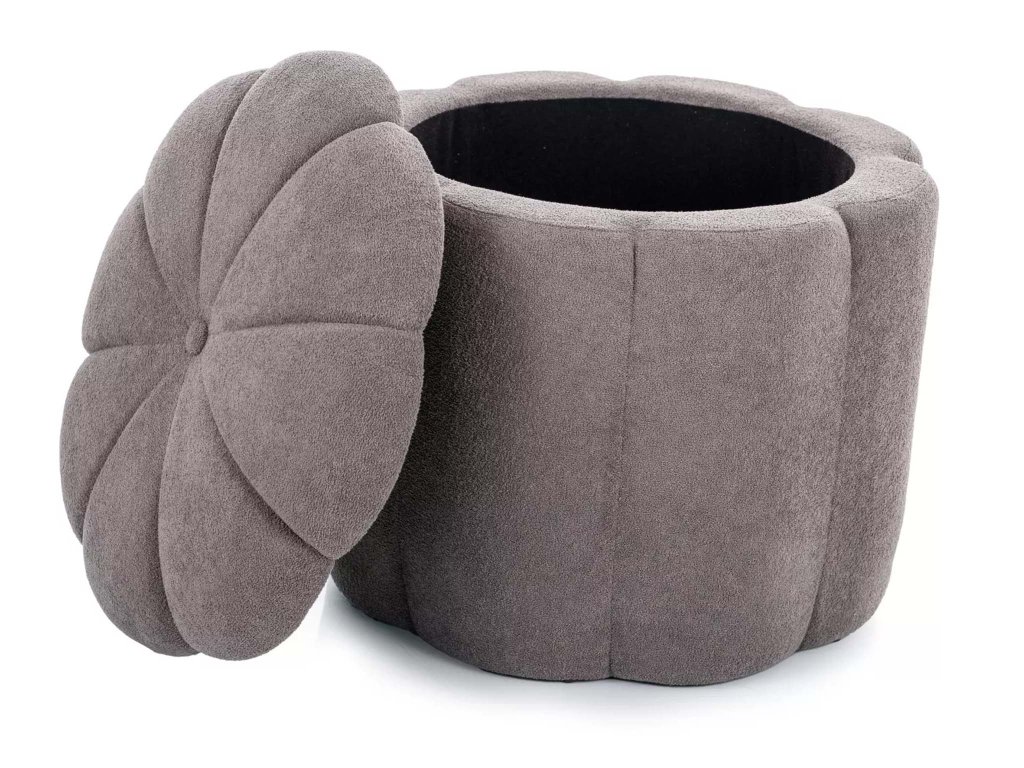 A puff kellemes tapintású, elegáns szürke szövettel van kárpitozva, amely könnyedén beillik a különféle lakberendezési stílusokhoz. Nagy előnye a felnyitható funkció, ugyanis az ülőfelület alatt egy praktikus tárolóhely kapott helyet, amely ideális takarók, játékok vagy magazinok tárolására.
