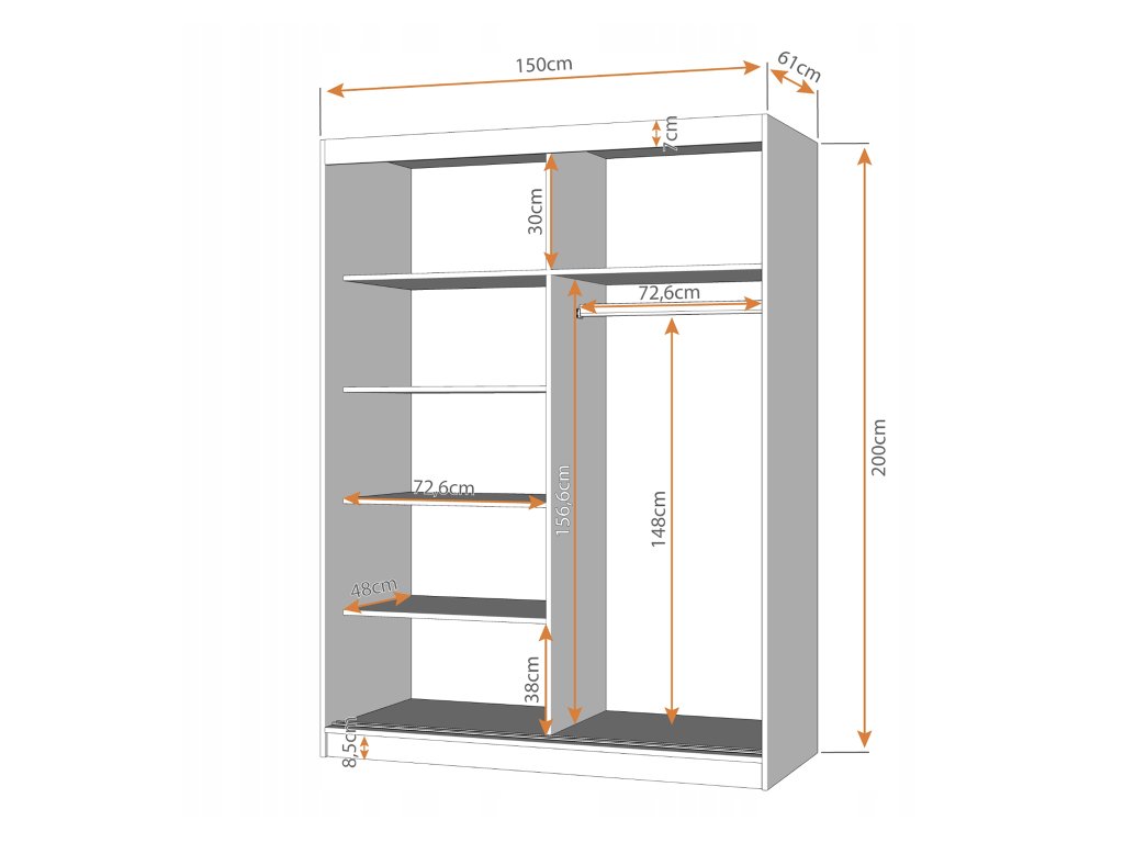 Univerzális többfunkciós ruhásszekrény, amely tökéletes választás kisebb helységekbe, folyosóra, ifjúsági szobába vagy gyerekszobába. A tágas szekrény magas minőségű 16 mm vastagságú laminált deszkából készült. Belső elosztása még a legigényesebb vásárló igényeinek is megfelel. A szekrényben akasztó rúd, valamint 6 polc található, ahová nemcsak ruhát, de ágyneműt vagy bármilyen más dolgot is pakolhat, úgy mint a mellékelt ábrán is látható. A szekrény több színben is megvásárolható.