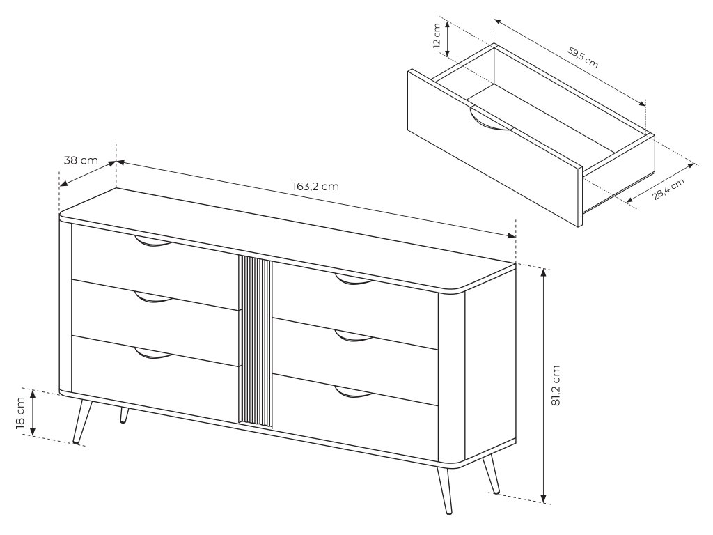 - Fiókok mérete (SzéxMaxMé): 59,5 x 12 x 28,4 cm