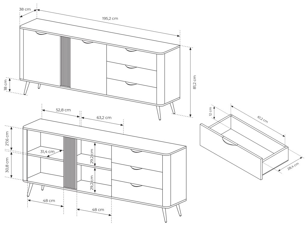 - Fiókok mérete (SzéxMaxMé): 61,2 x 12 x 28,4 cm