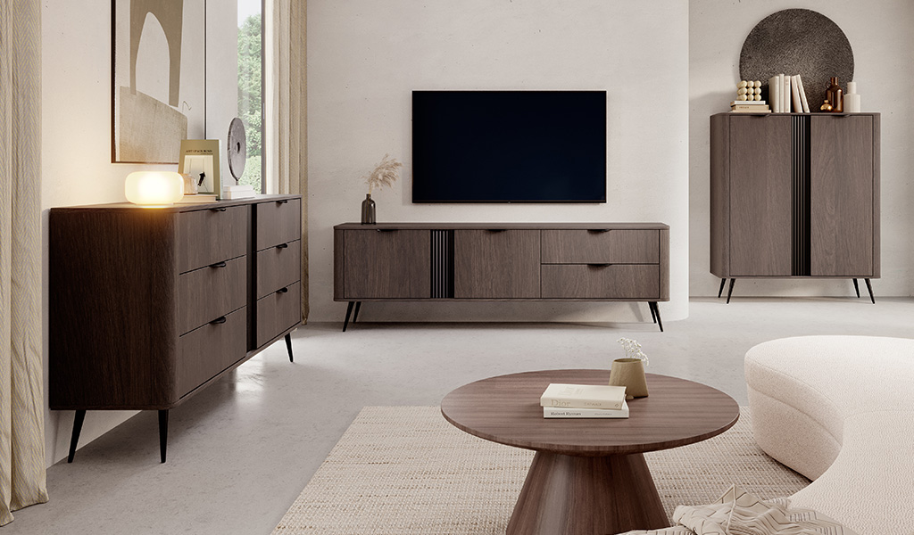 A VERIS nappali bútor garnitúra stílusos és modern bútordarabokat kínál a nappaliba. A bútor család több praktikus és elegáns elemet is tartalmaz: TV szekrényt, különböző méretű komódokat, könyvespolcot, sőt még egy éjjeliszekrény is.