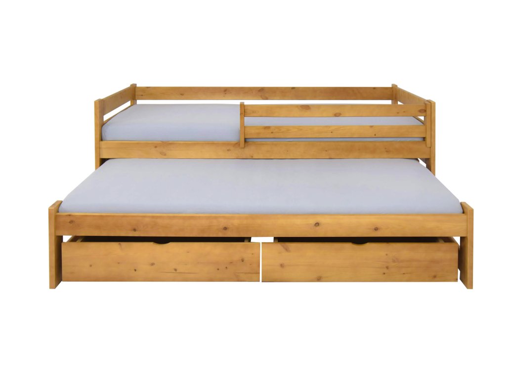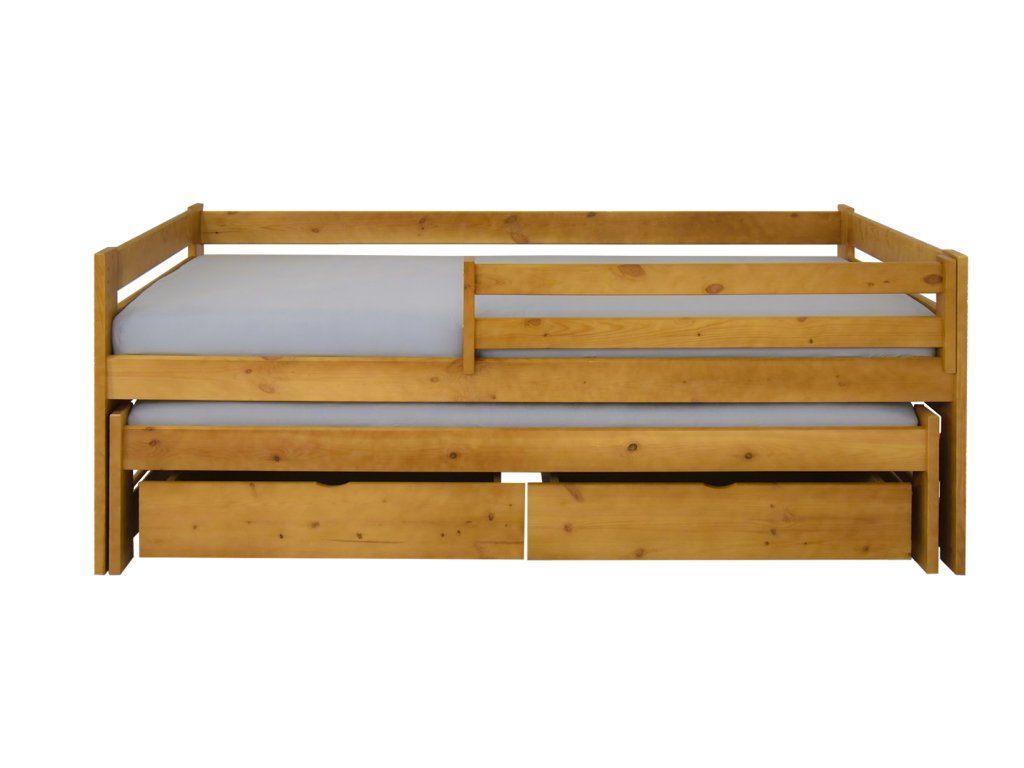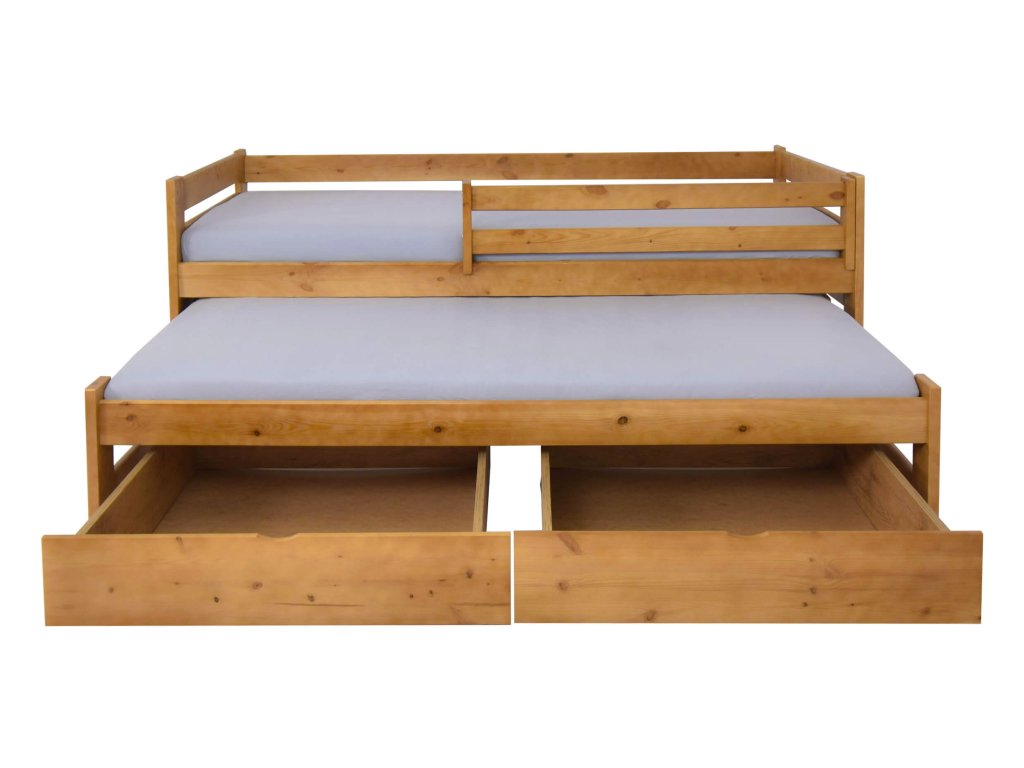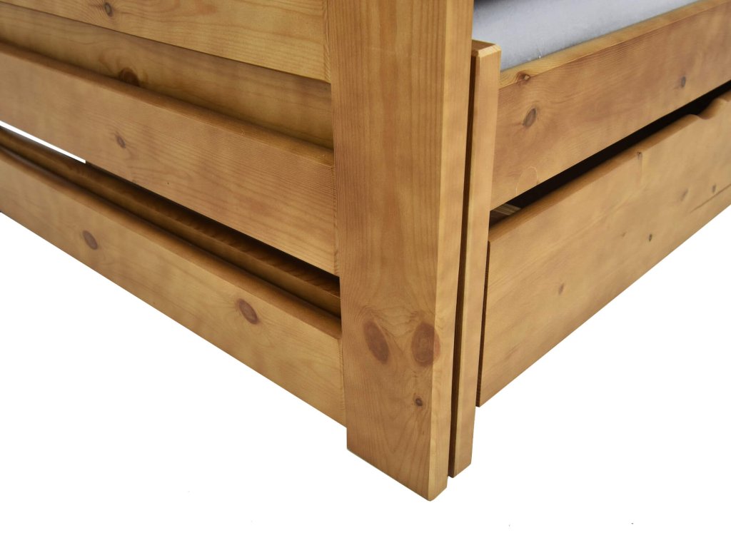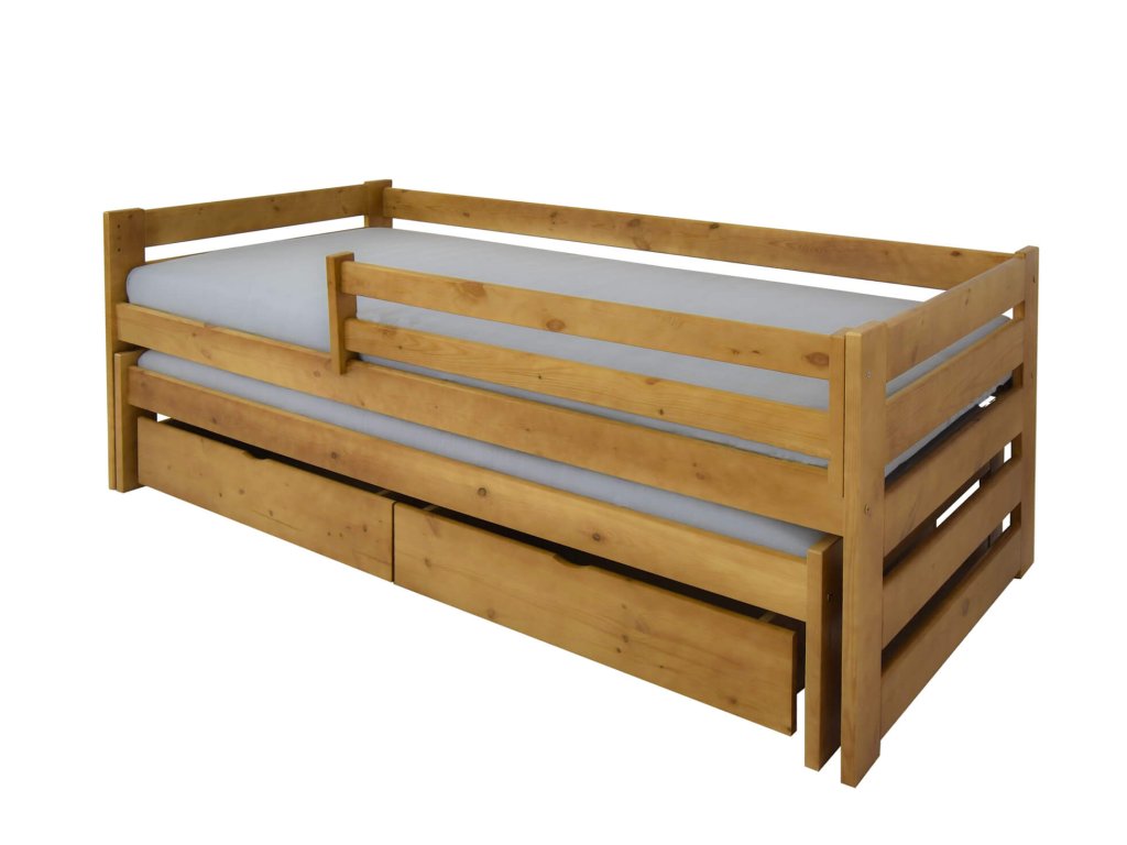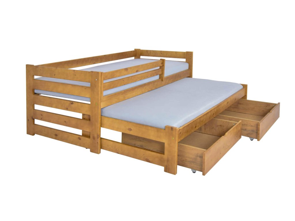 A VERONIKA 7 gyerekágy 200x90 cm kihúzható vendégággyal és ágyneműtartóval tömör borovi fenyőből, melynek köszönhetően nagyon stabil a szerkezete. Az ágy tökéletes választás a kisebb gyerekszobákba is. Az ágy tölgy színben kapható, 3x lakkozva természetre nem ártalmas ökológiai lakkal. Az ágy két tároló fiókkal is rendelkezik, amelyek műanyag kerekeken mozognak, hogy ne sértsék meg a padlót. Nincsenek az ágyhoz rögzítve, így könnyen mozgathatók. Az ágy leesésgátlóval együtt kapható, amely könnyen le- és felszerelhető.