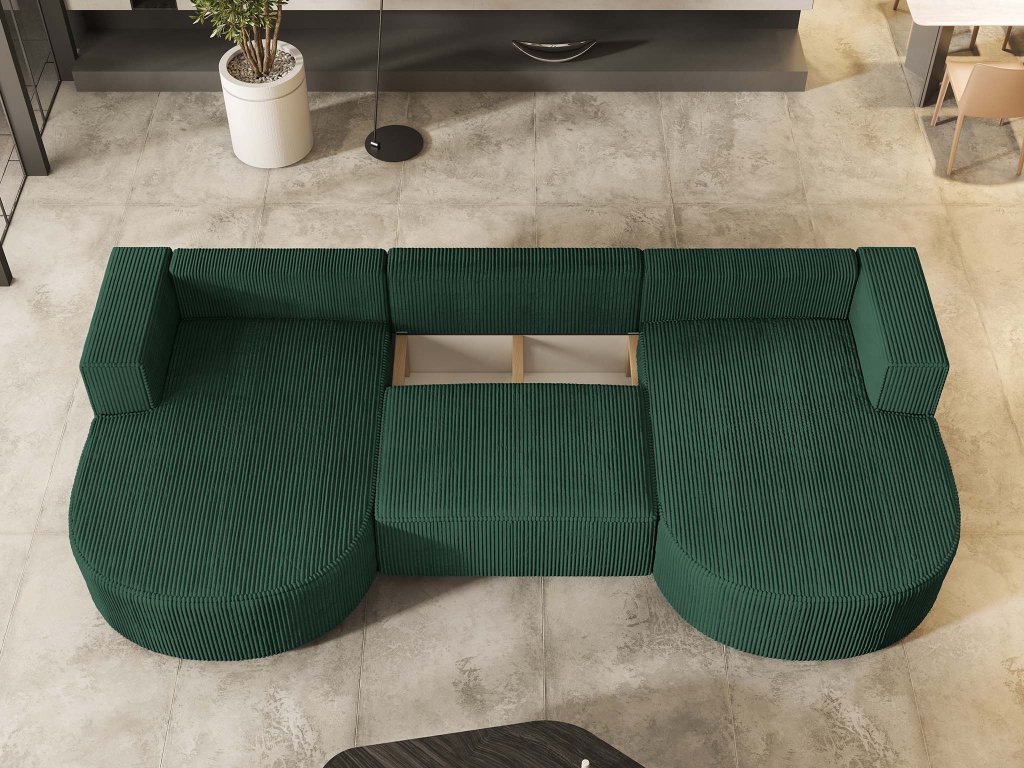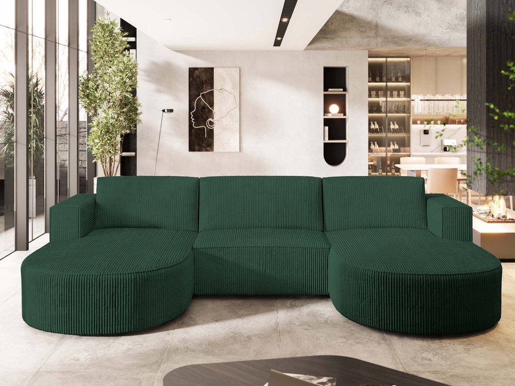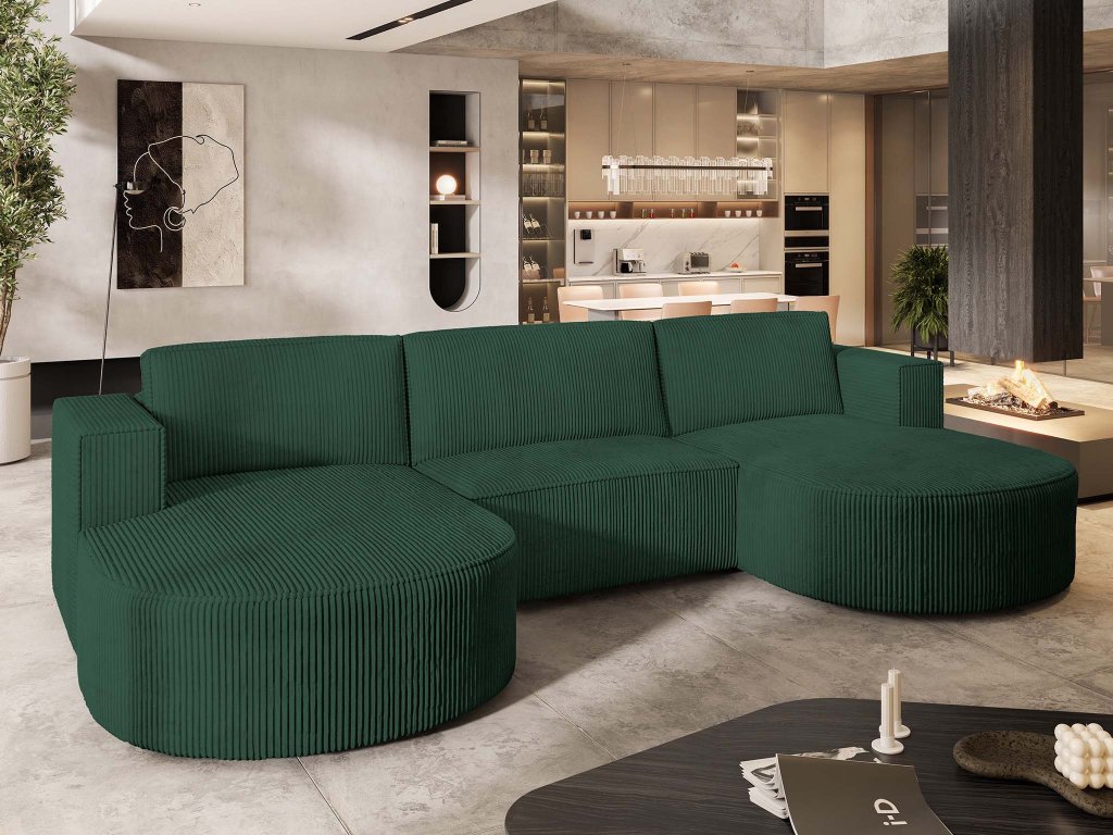 Ez a feltűnő sötétzöld kárpitozással rendelkező VEZZO P kihúzható U alakú ülőgarnitúra nem marad figyelmen kívül egyetlen otthonban sem. U alakú formája bőséges helyet kínál a pihenéshez és a közös családi pillanatokhoz.