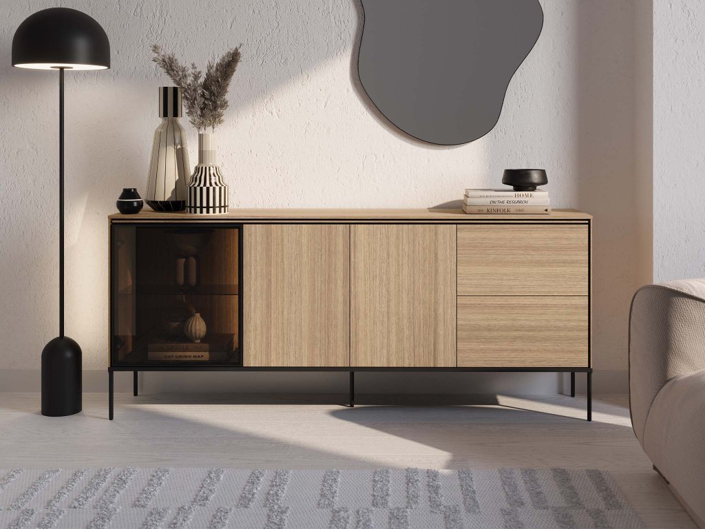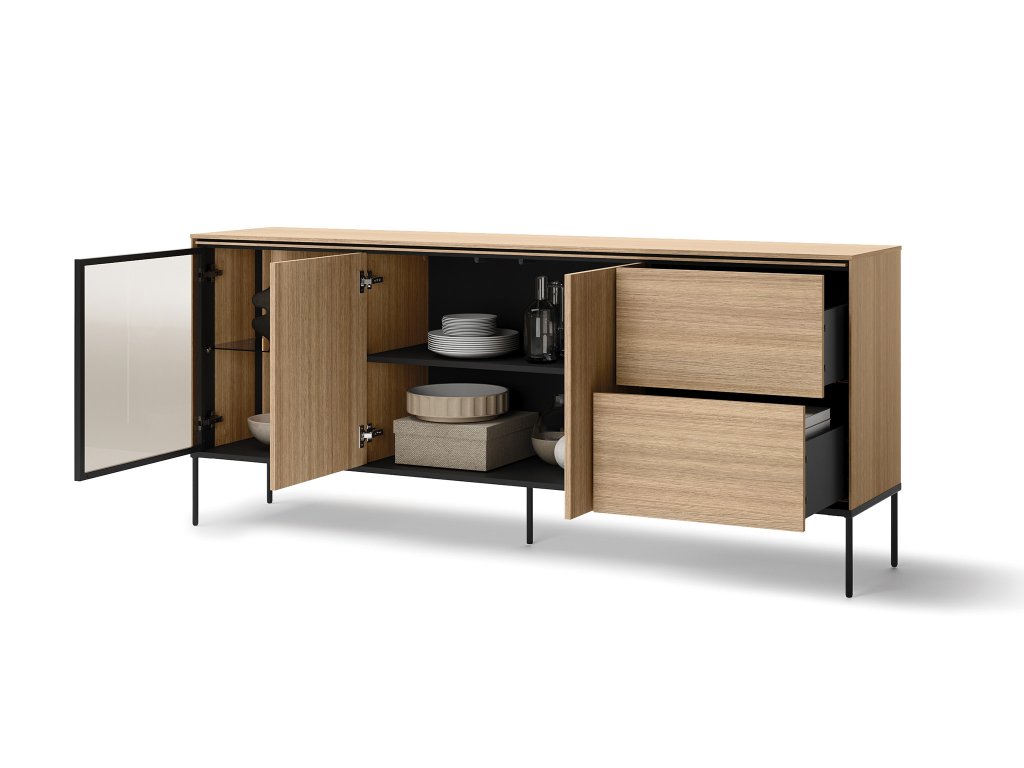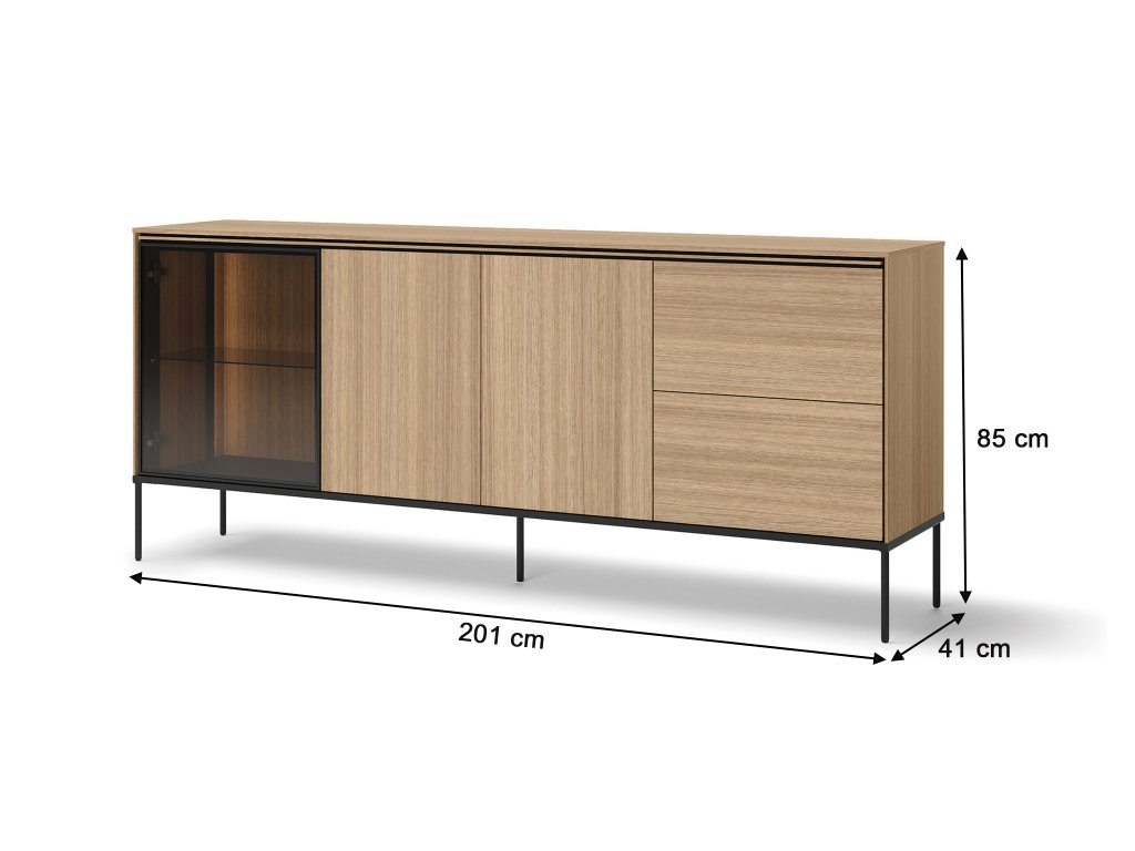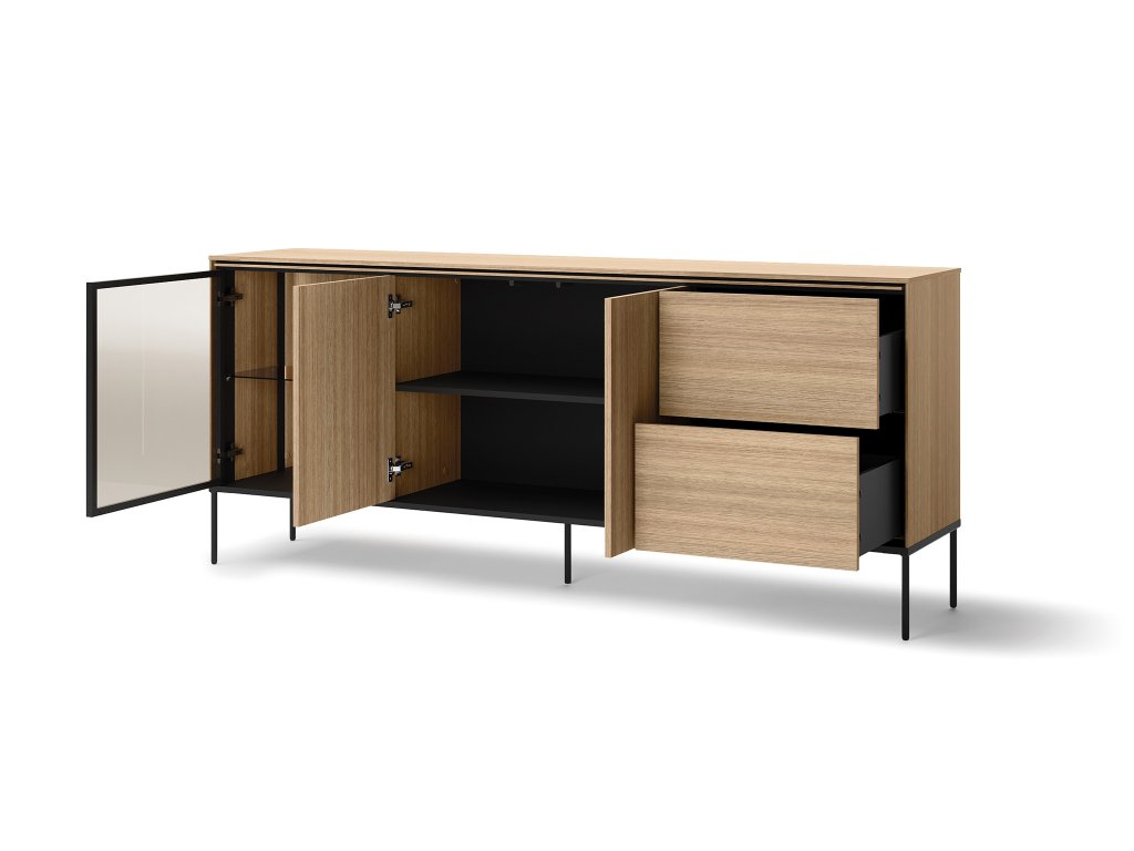 A VISSO 2D1W2S széles komód LED világítással. A komód a méretének köszönhetően számos tároló helyet biztosít a nappaliban, a hálószobában vagy az előszobában. A komód jobb oldalában két tágas fiók található, amelyek fogantyú nélküli, úgynevezett push-to-open nyitással rendelkeznek. A bal szélében az üveges ajtó mögött egy üvegpolc található. Az üvegajtó mögötti rész LED világítással is rendelkezik. Középen a kétajtós szekrényben egy fa polcot helyeztek el.