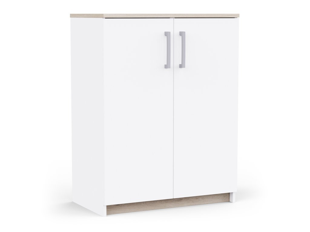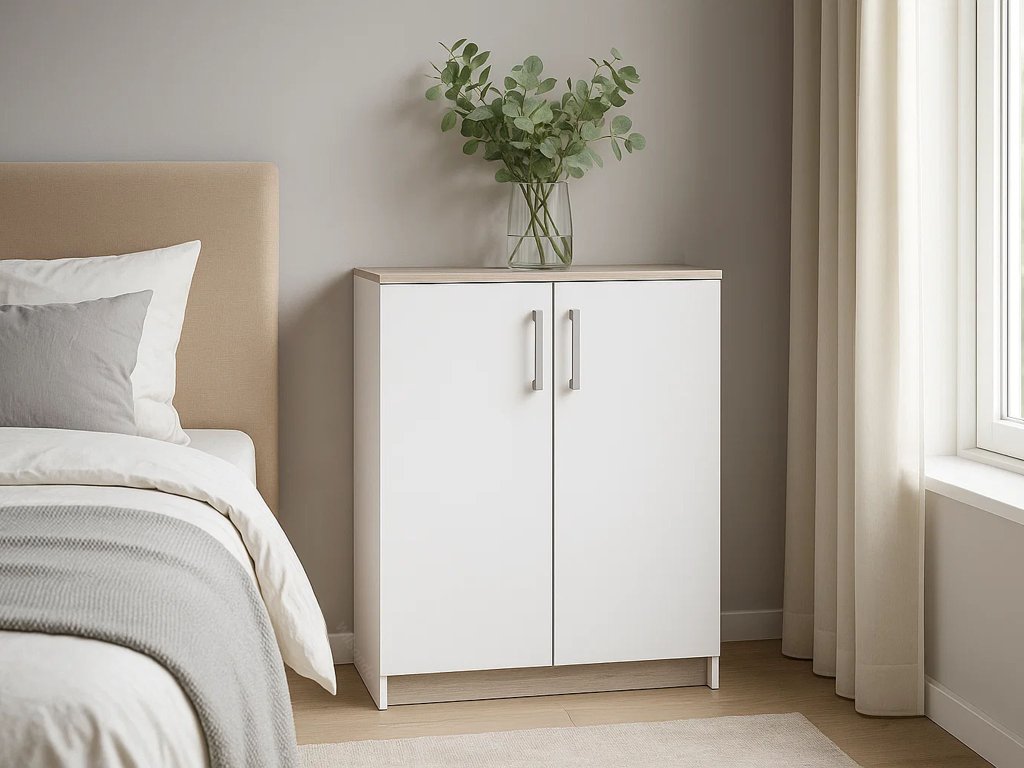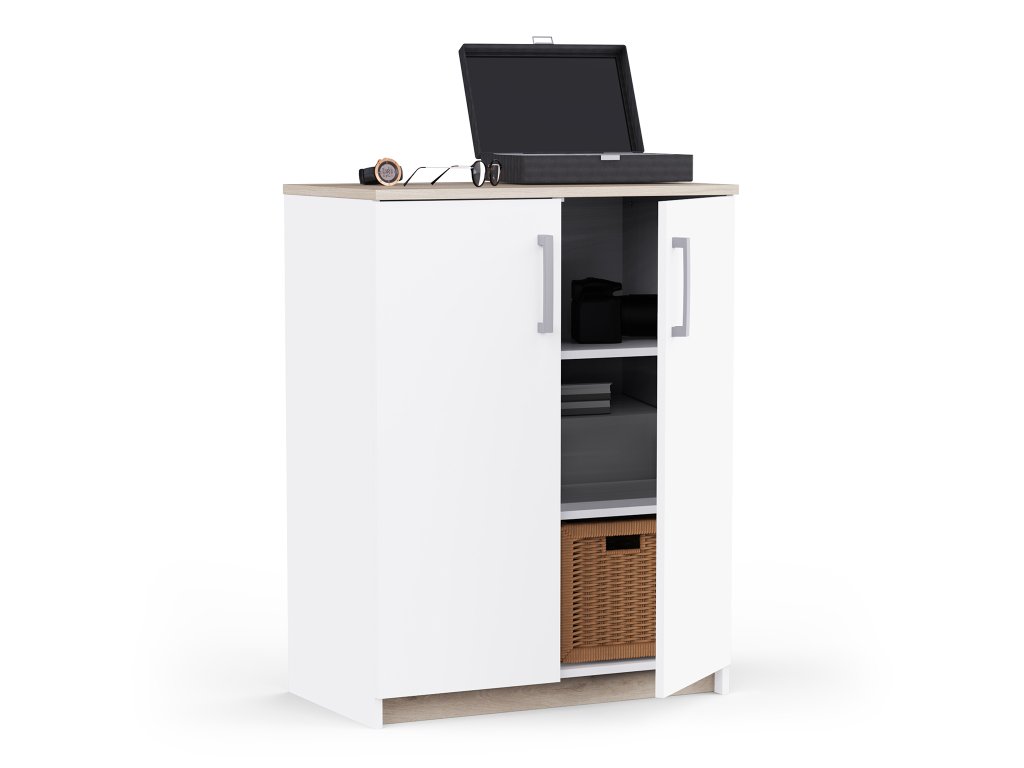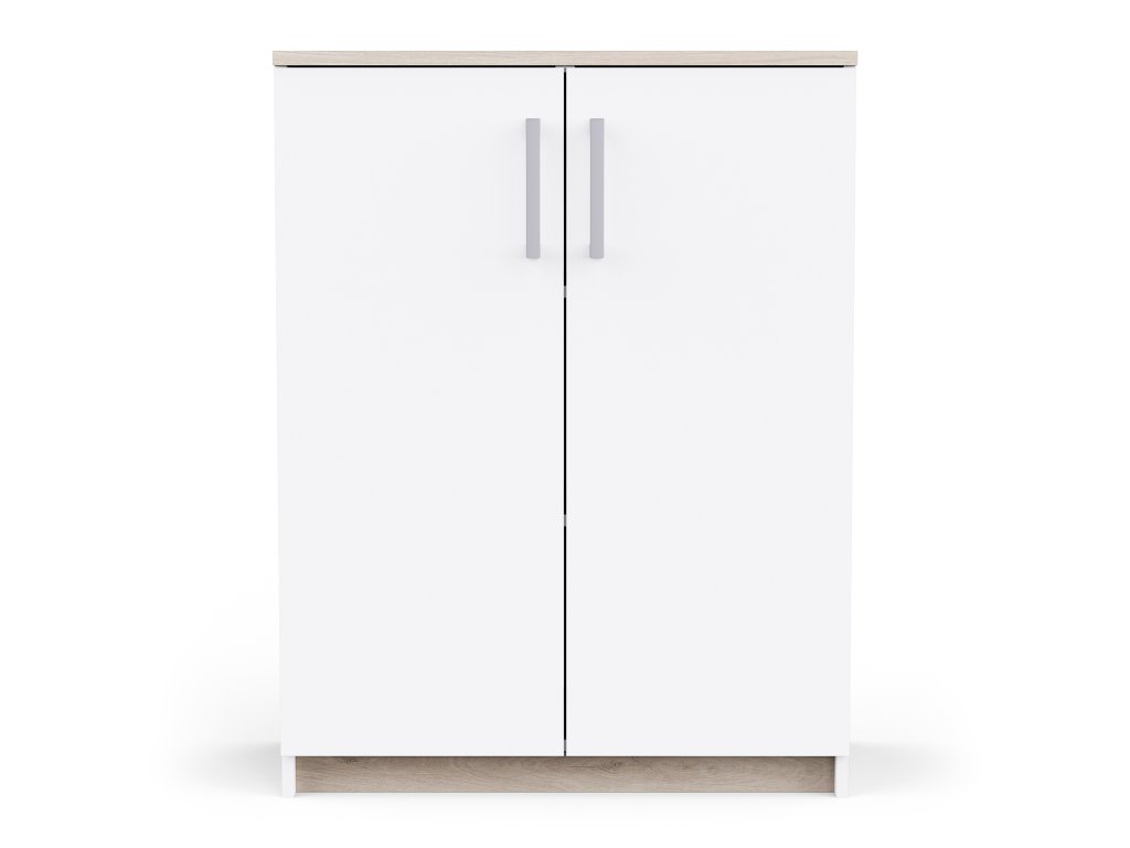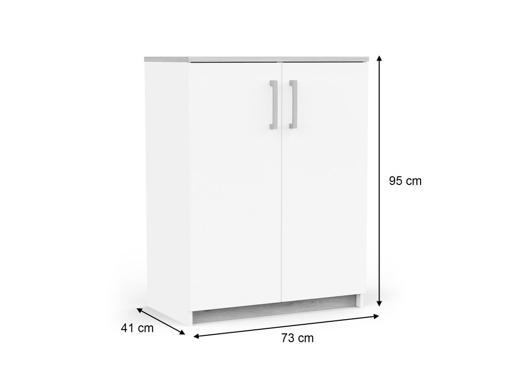 Ez a kétajtós komód két tágas polcot rejt, amelyek praktikus megoldást kínálnak ruhák, dokumentumok vagy mindennapi használati tárgyak tárolására. Ideális választás nappaliba, hálószobába vagy dolgozószobába, ahol értékelni fogja egyszerű tisztán tarthatóságát és letisztult, felesleges részletektől mentes megjelenését.