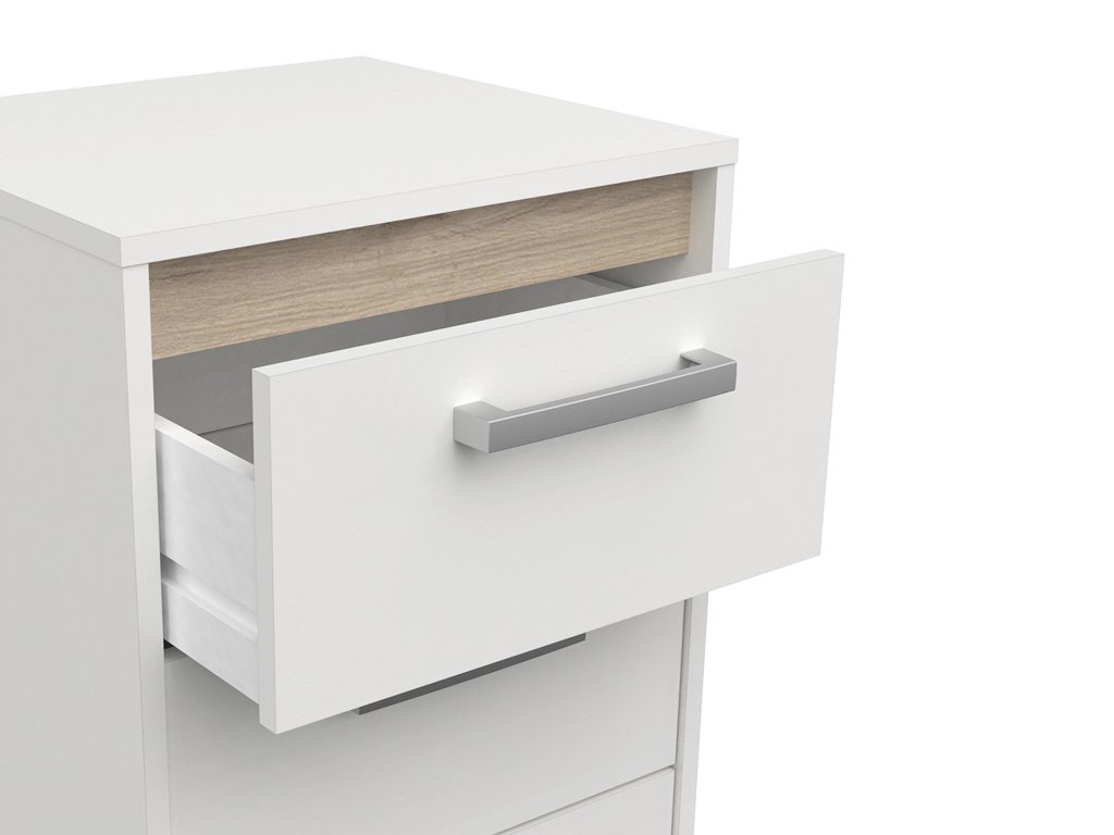 Egyszerű, fehér dekorációjú dizájnja modern és univerzális hatást kelt, így a komód jól illeszkedik különböző belsőépítészeti stílusokhoz, például iparihoz vagy skandinávhoz. Minőségi és tartós laminált forgácslapból készült, amely egyszerűen karbantartható – elég alkalmanként nedves ronggyal áttörölni.