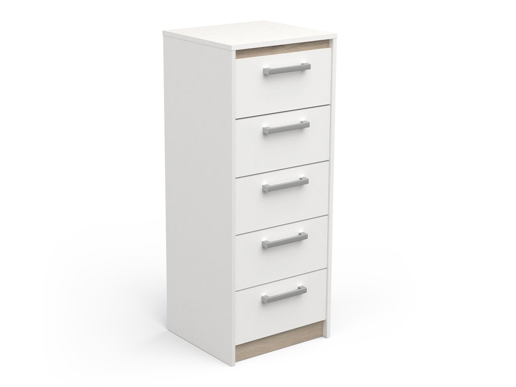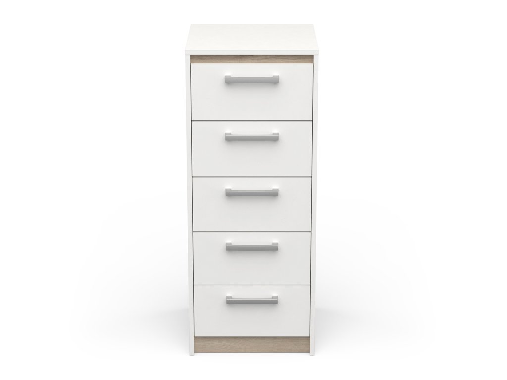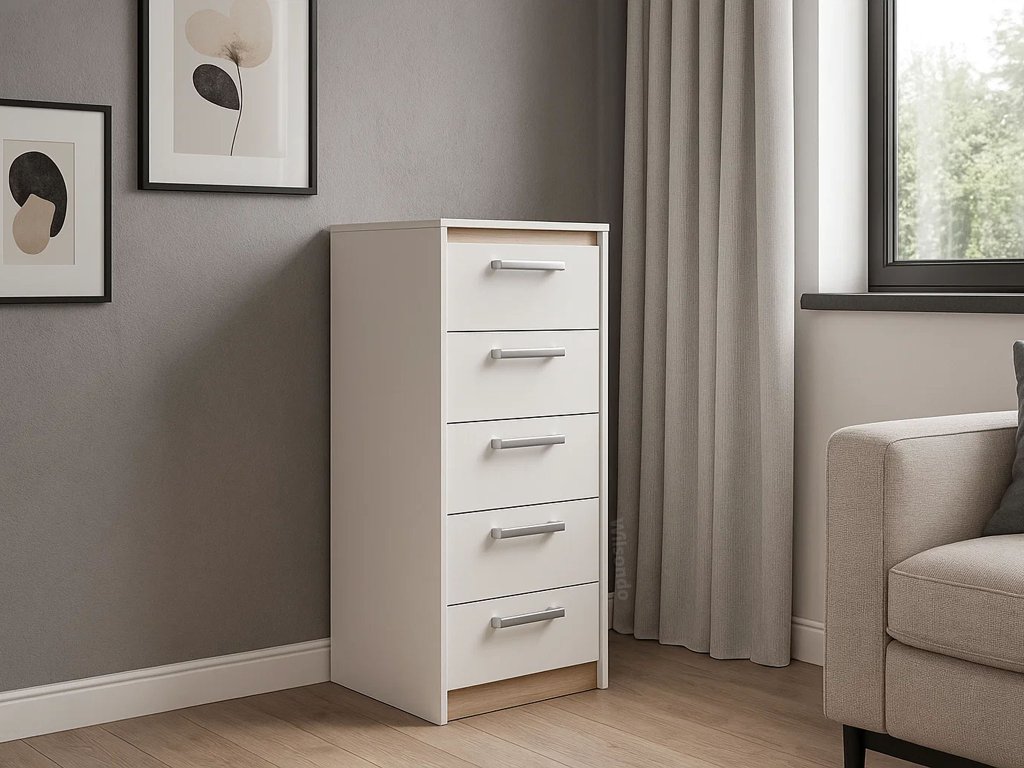 A Watson keskeny komód időtálló fehér színben ideális megoldás kisebb terekbe, ahol praktikus és ugyanakkor stílusos tárolóhelyre van szükség. Öt keskeny fiókja elegendő helyet kínál apróbb ruhadarabok, kiegészítők vagy irodaszerek tárolására, és vertikális kivitelezése helyet takarít meg, miközben optikailag nyújtja a teret.