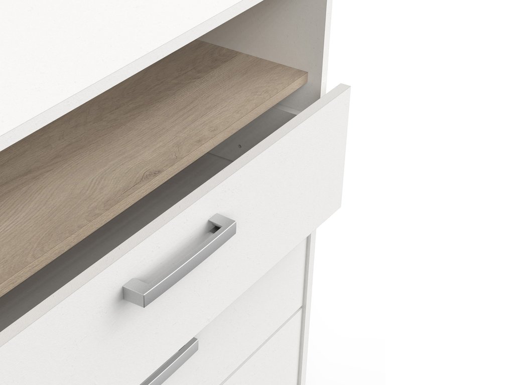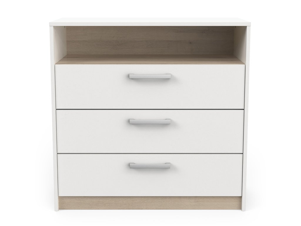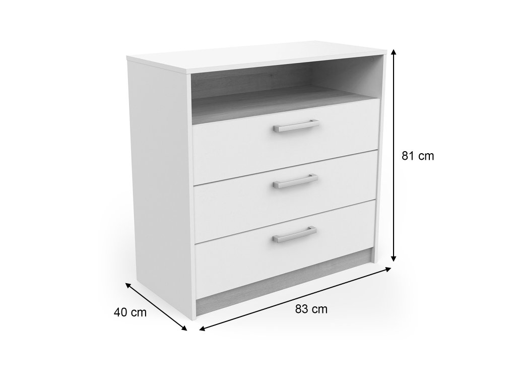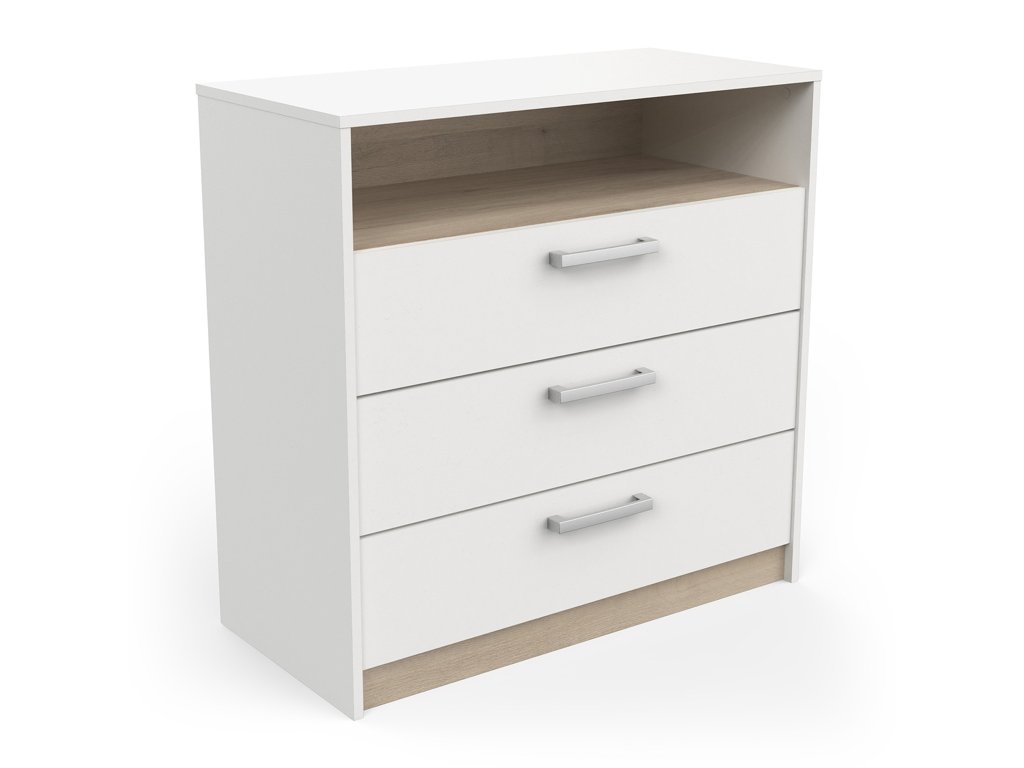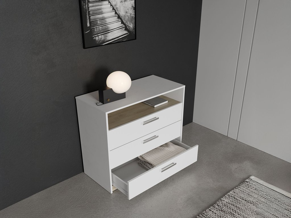 A Watson komód fehér színben stílusos és funkcionális kiegészítője minden hálószobának vagy nappalinak. Tiszta vonalvezetésének köszönhetően világosságot és modern eleganciát visz a térbe. Három tágas fiókja lehetőséget ad ruhák, iratok vagy más személyes tárgyak elhelyezésére, a nyitott polc pedig ideális dekorációk, könyvek vagy mindennapi szükségletek számára.